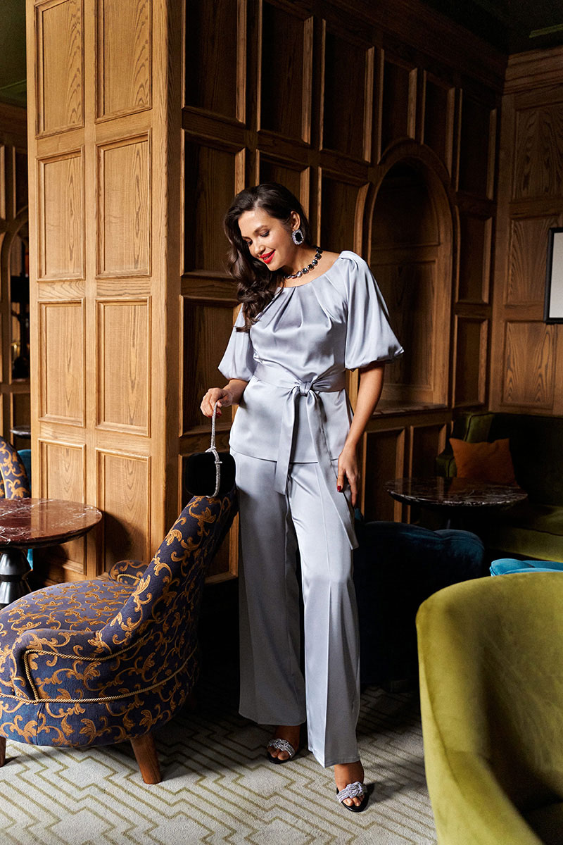 Элегантный наряд состоит из 2-х предметов одежды: блузки и брюк.