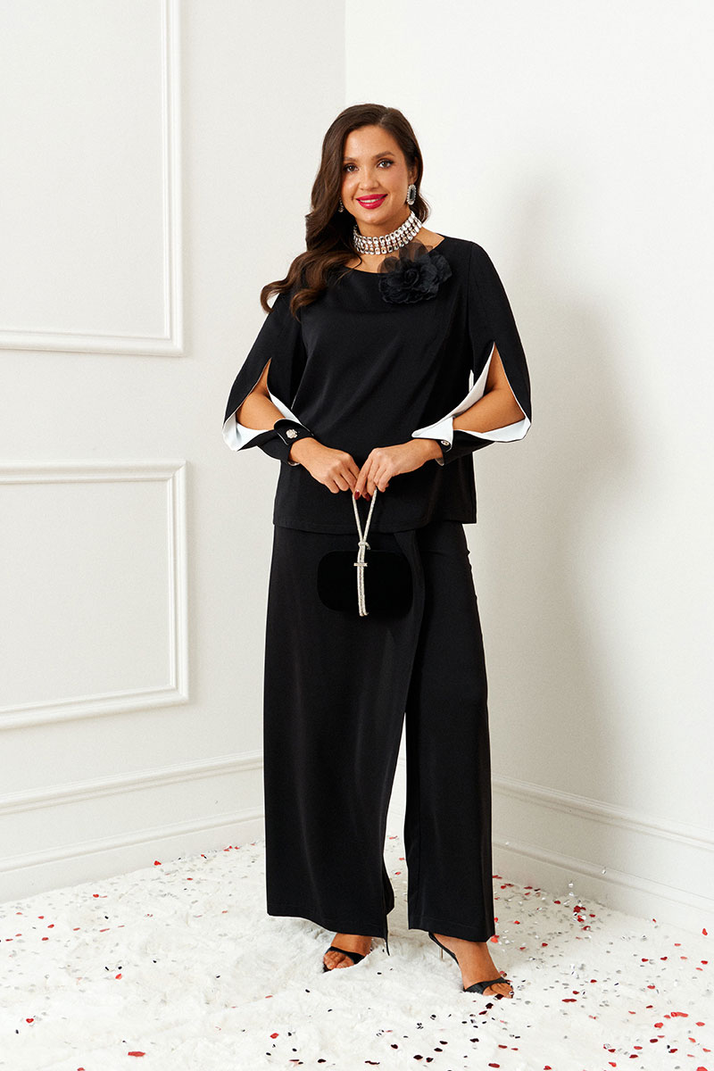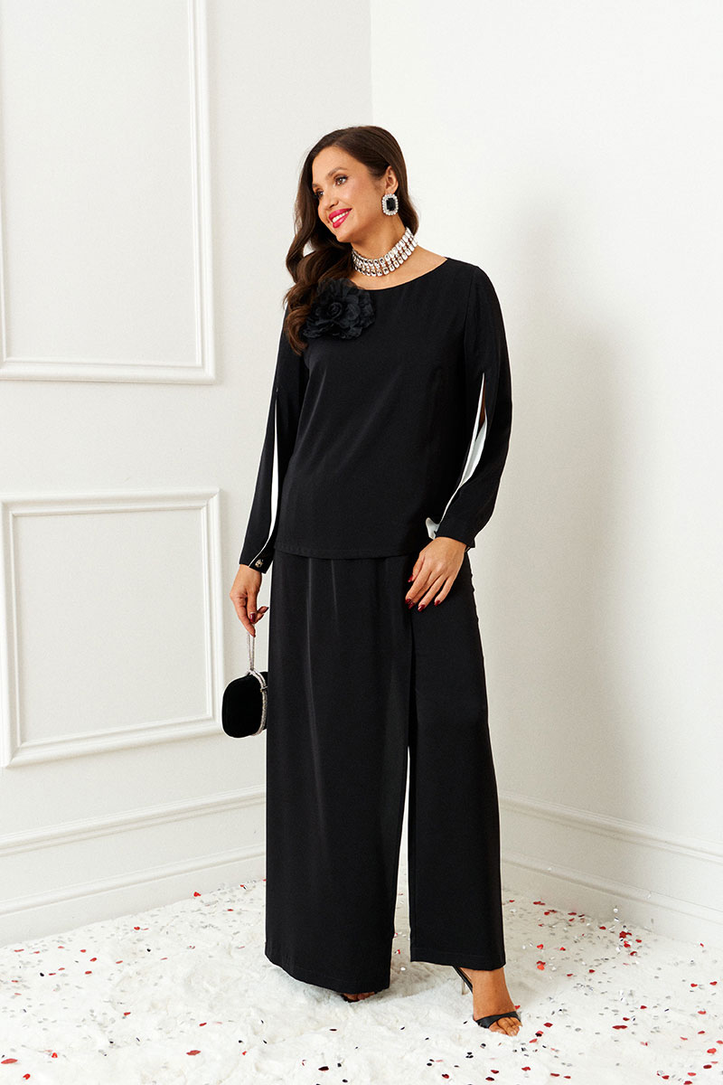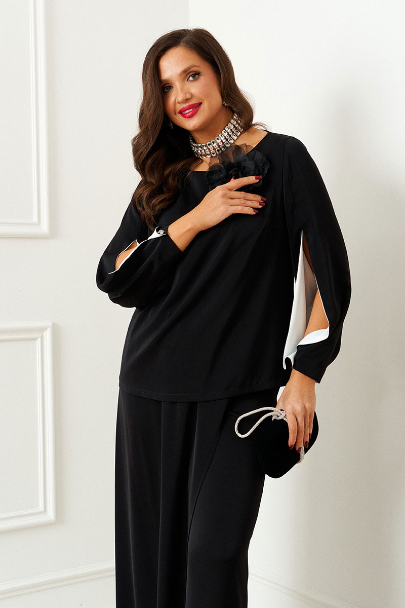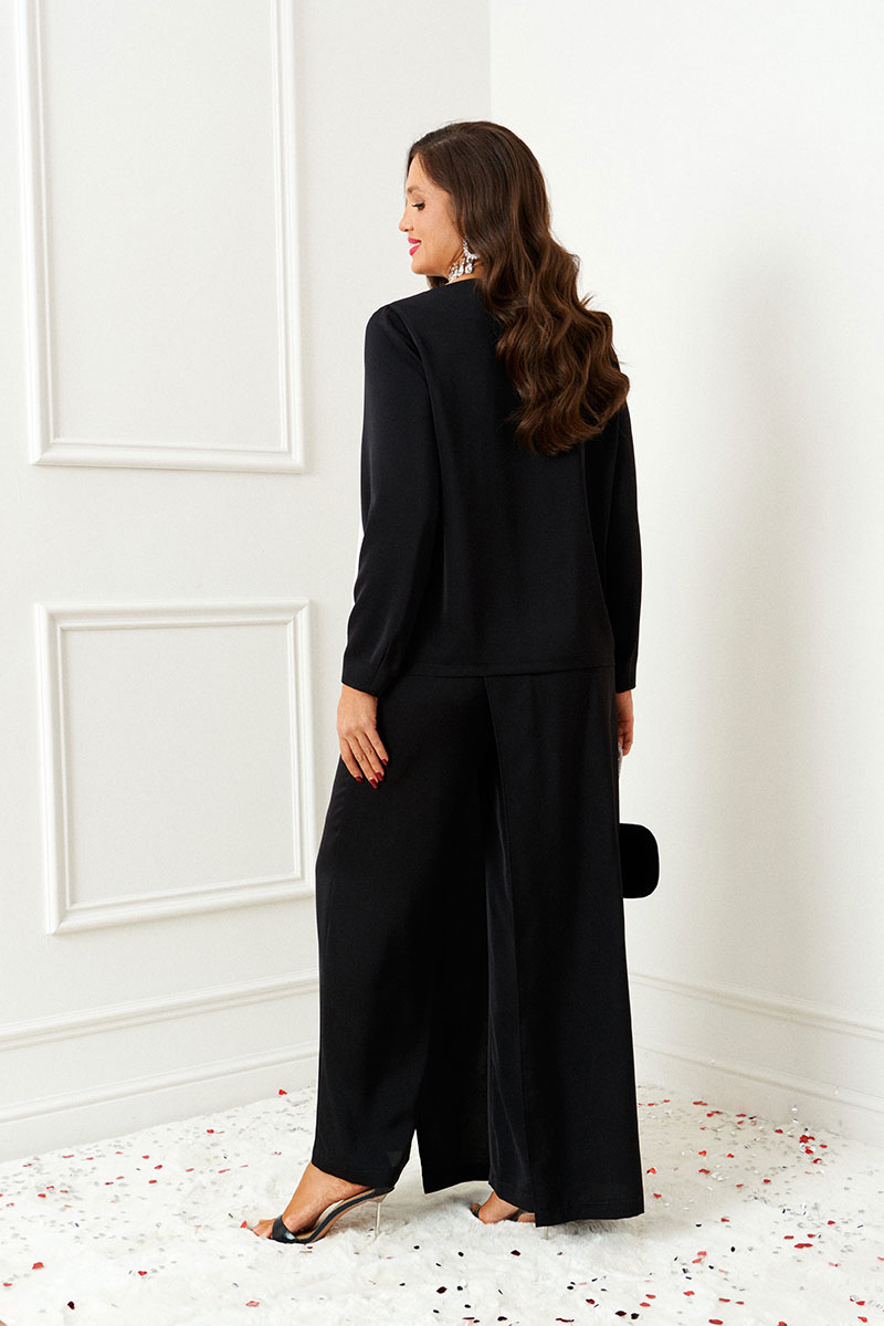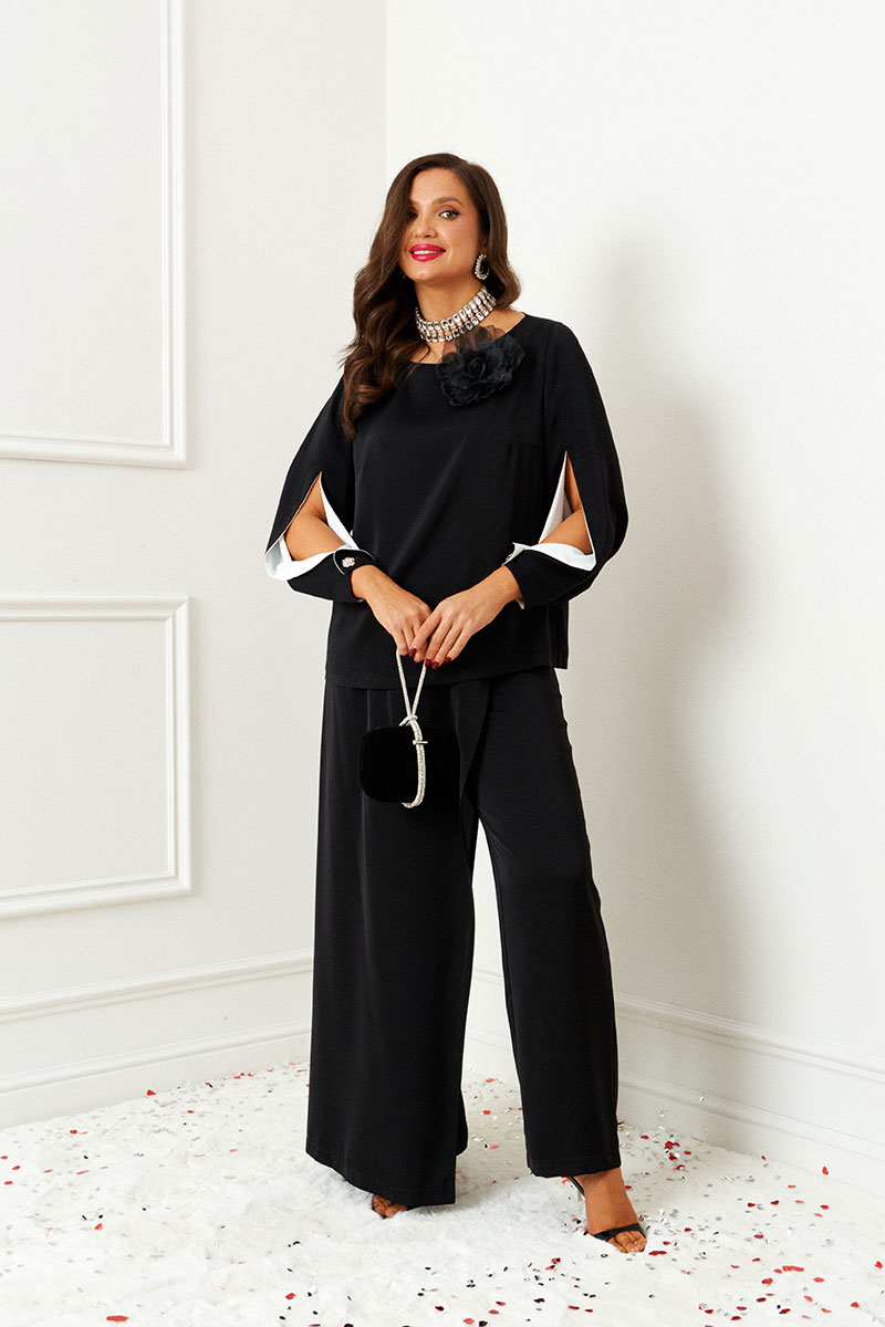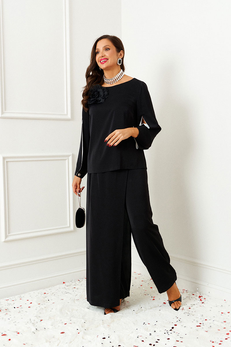 Изысканный нарядный костюм состоит из 2-ух предметов: блузки и брюк. Выполнен из костюмно-смесового полотна. У этой ткани нежная, гладко-бархатистая фактура, приятная на ощупь и матовая поверхность. Она легко драпируется и очень выгодно и дорого подчёркивает силуэт.