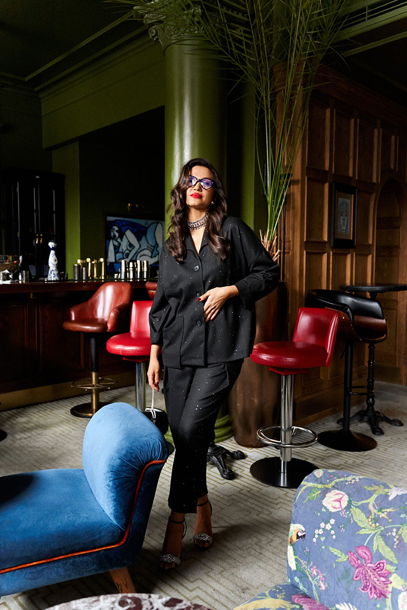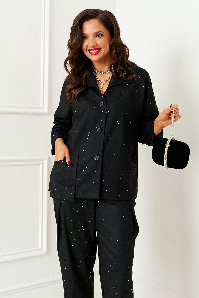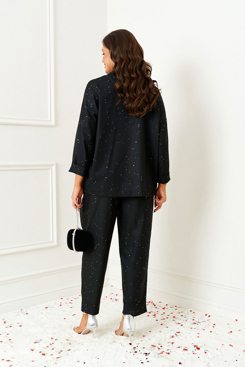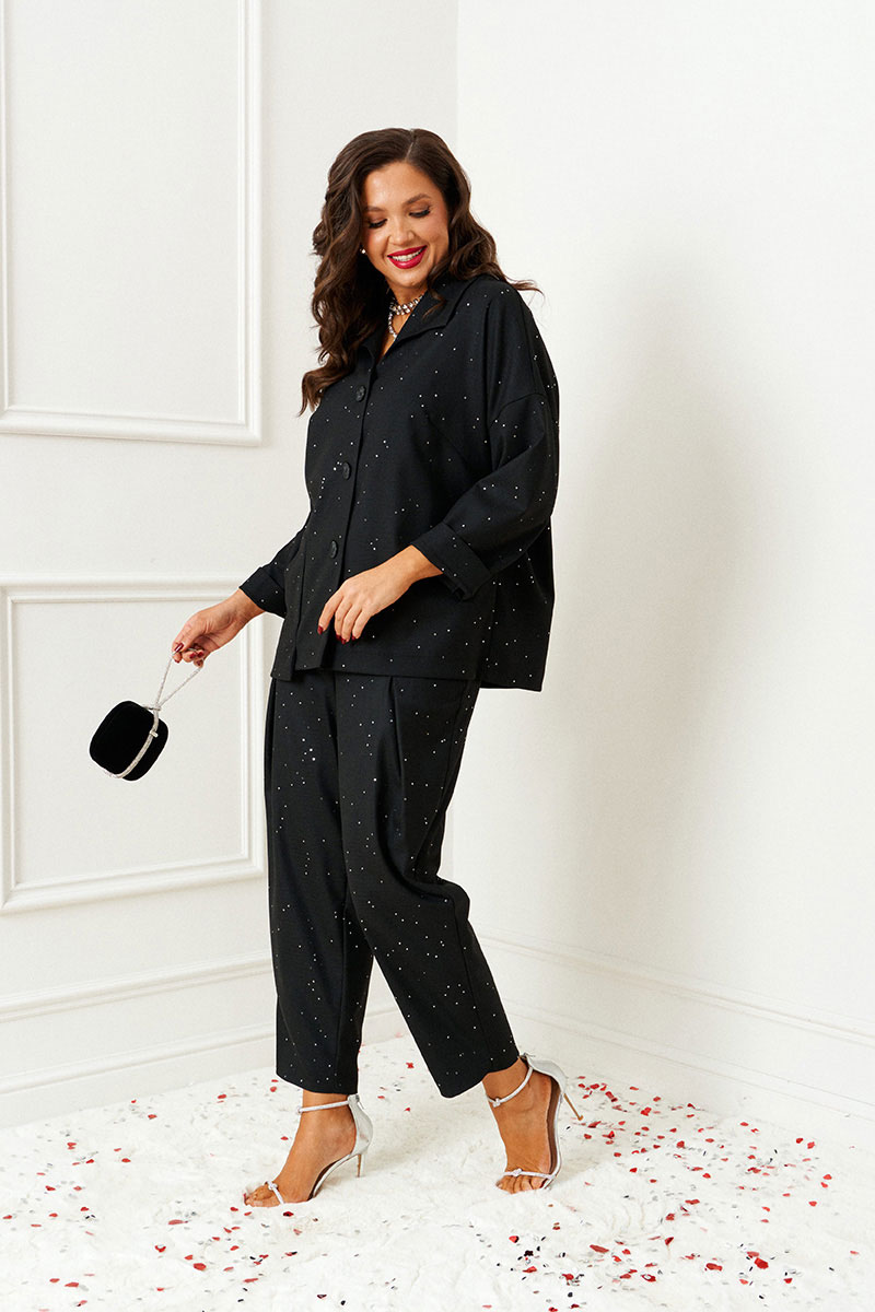 Костюм состоит из 2-х предметов одежды: рубашки и брюк. Выполнен из костюмной ткани стильного дизайна.