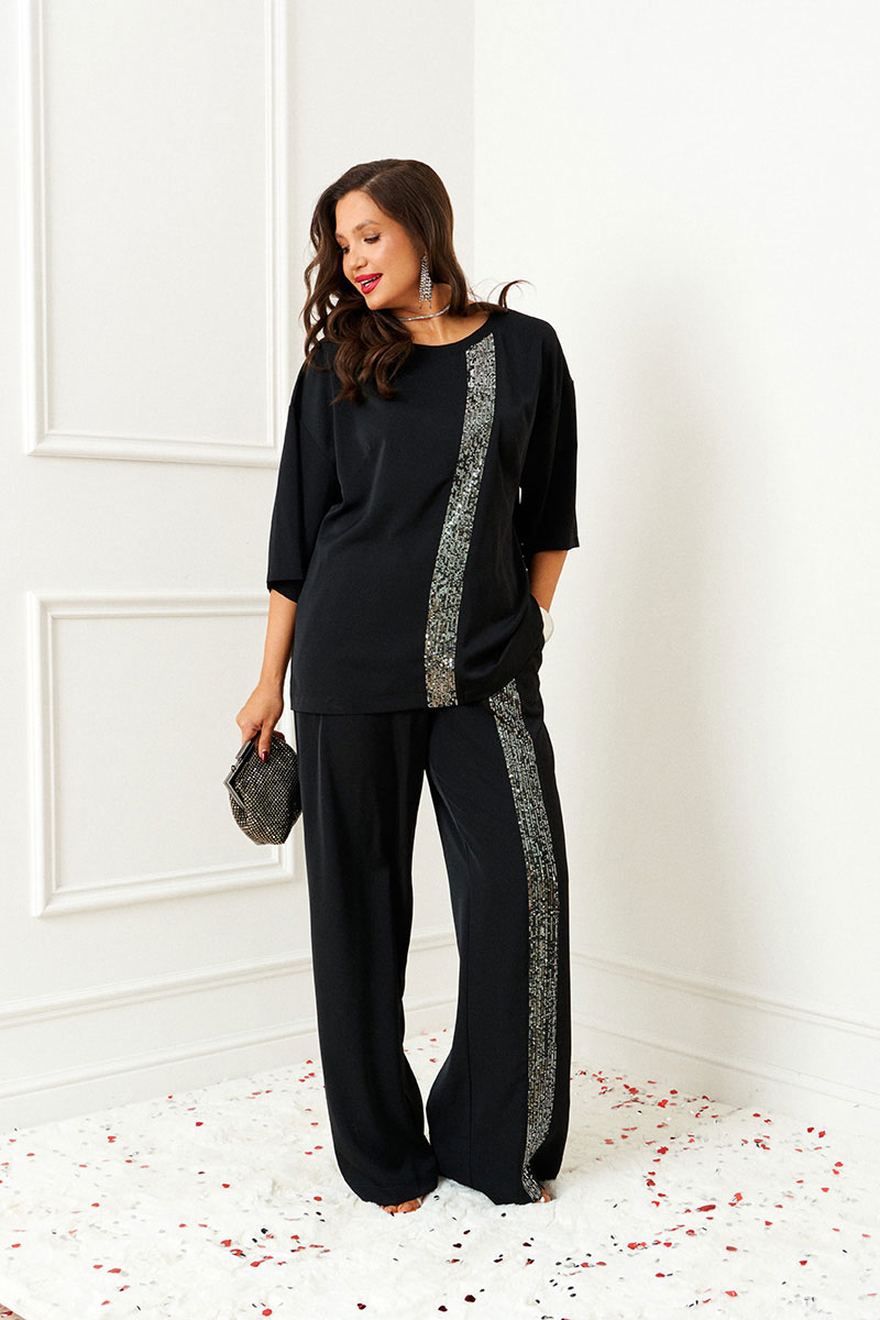 Изысканный костюм состоит из 2-ух предметов: блузки и брюк. Выполнен из костюмно-смесового полотна. У этой ткани нежная, гладко-бархатистая фактура, приятная на ощупь и матовая поверхность. Она легко драпируется и очень выгодно и дорого подчёркивает образ.