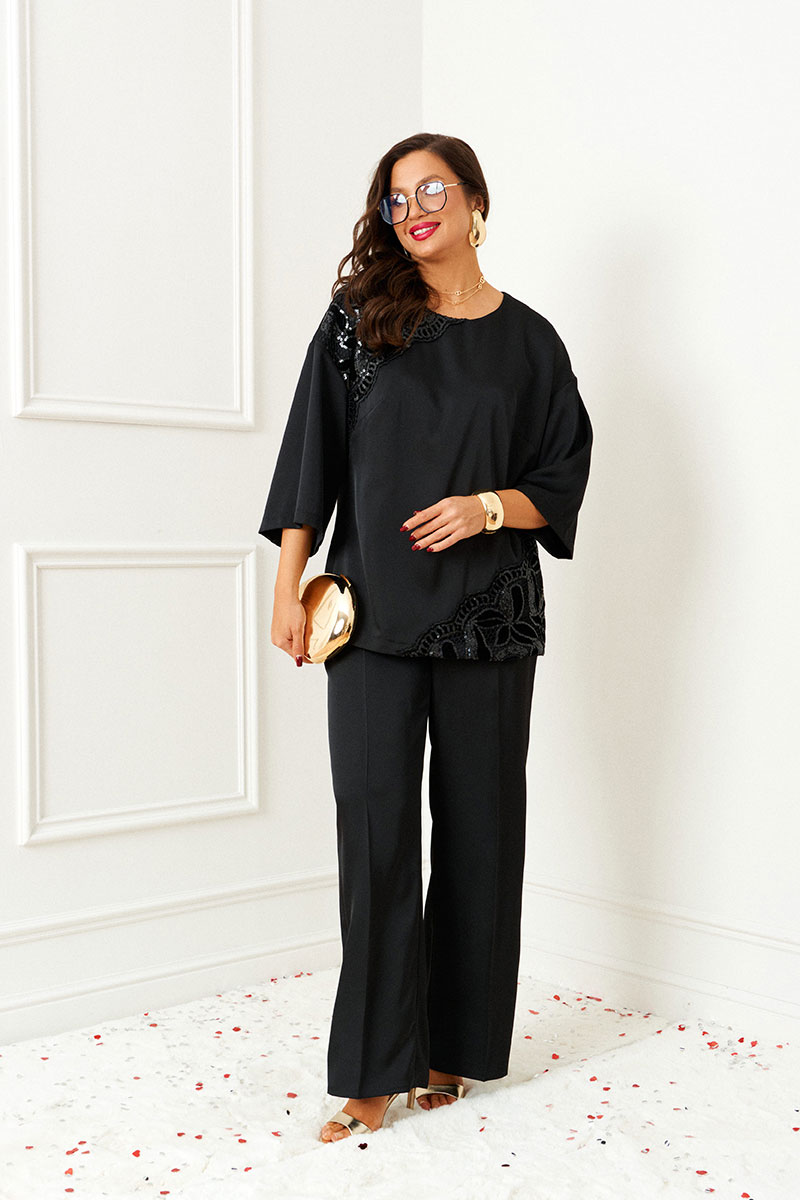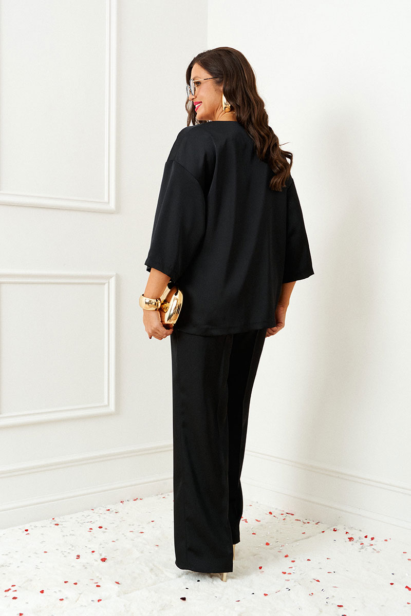 Изысканный костюм состоит из 2-ух предметов: блузки и брюк. Выполнен из атласного полотна в сочетании с кружевом. Основная ткань нежная, гладкой фактуры, приятная на ощупь и с блестящей поверхностью, она легко драпируется и очень выгодно и дорого подчёркивает образ; отделочная ткань придает праздничный шарм.