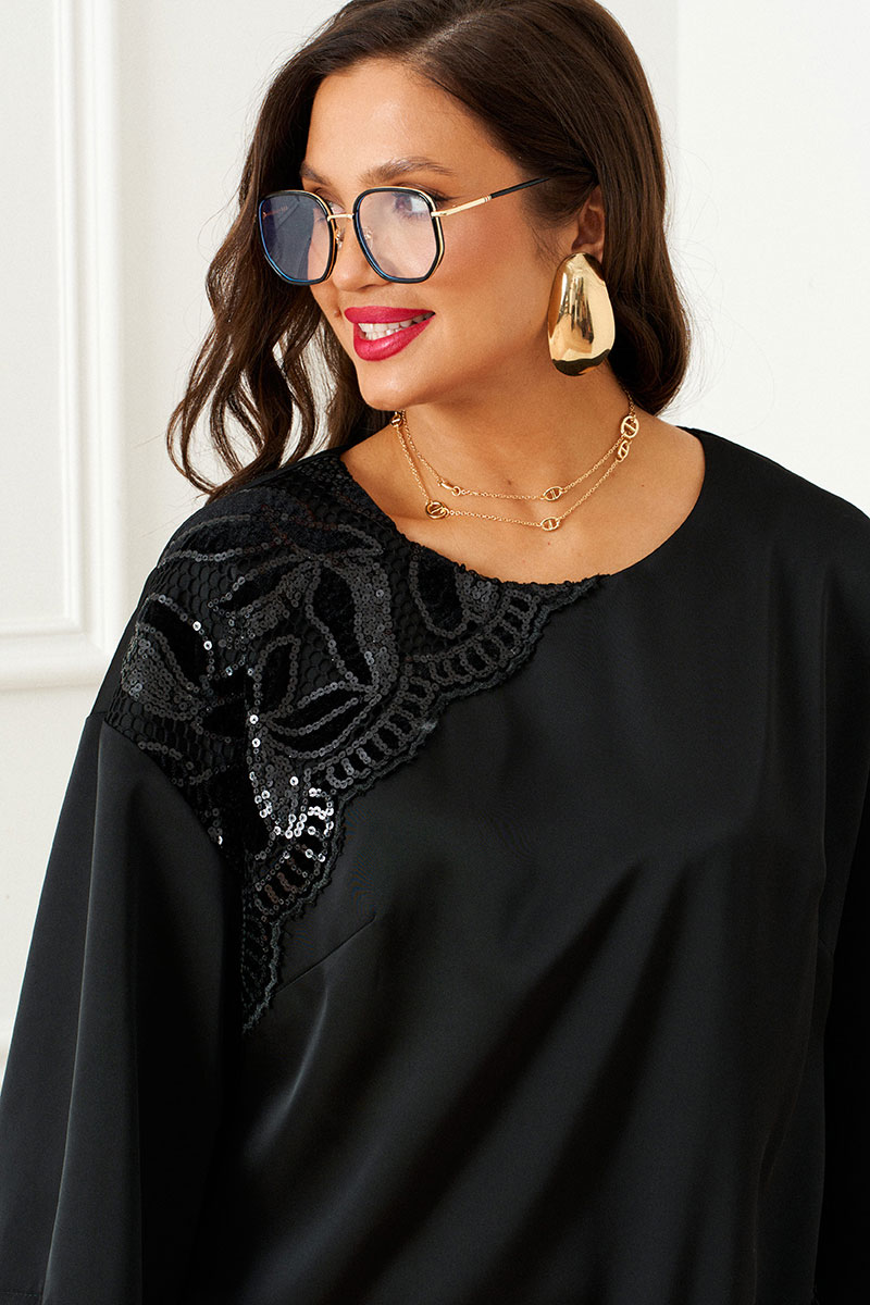 Блузка свободного силуэта, с удлиненной линией плеча, длиной до середины бедра.