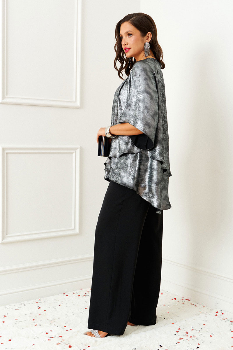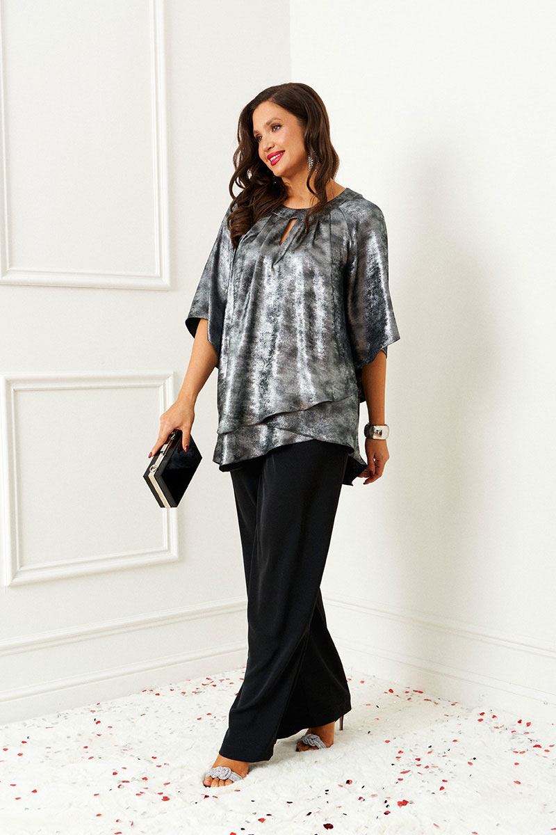 Изысканный костюм состоит из 2-ух предметов: блузки и брюк. Выполнен из эластичного полотна в сочетании с ворсовым шифоном. Брючная ткань нежная, гладко-бархатистой фактуры, приятная на ощупь, она легко драпируется и очень выгодно и дорого подчёркивает образ; блузочная ткань придает праздничный шарм.