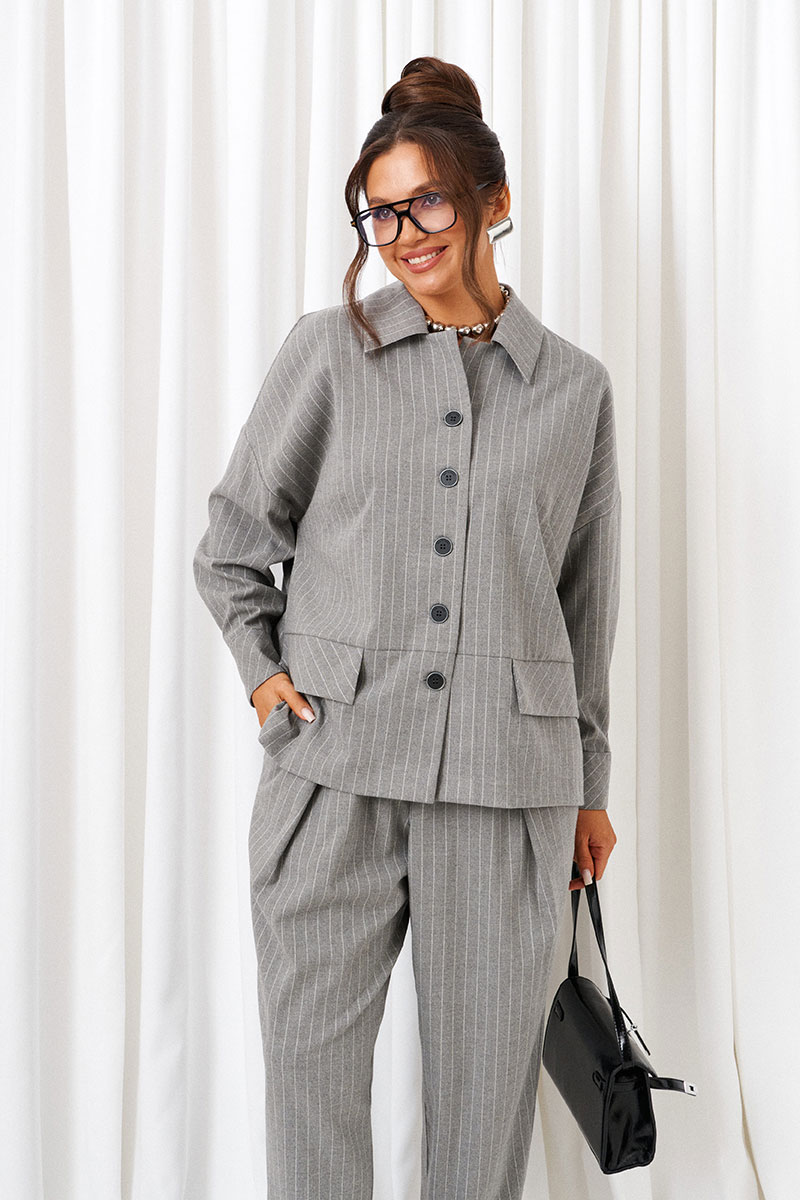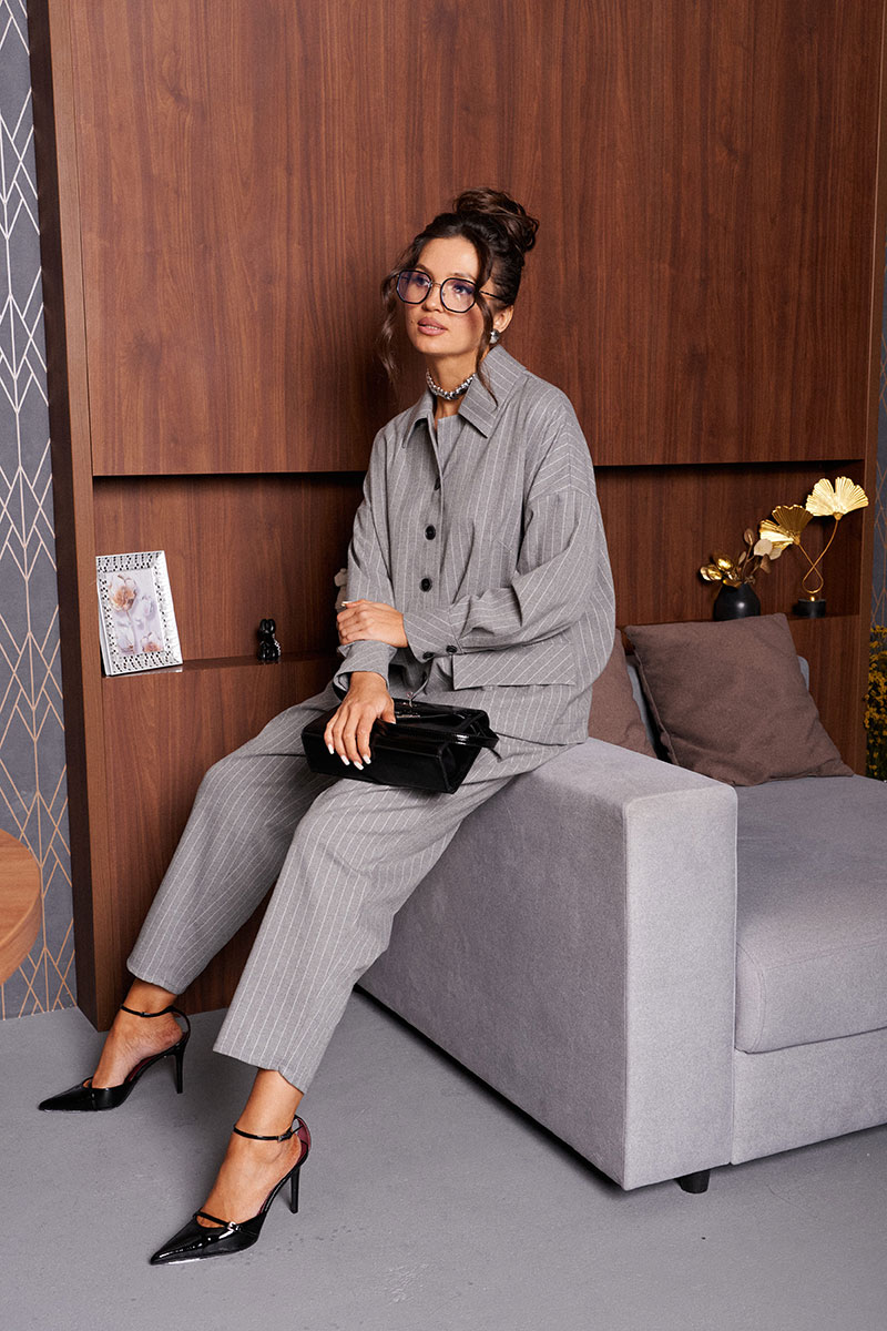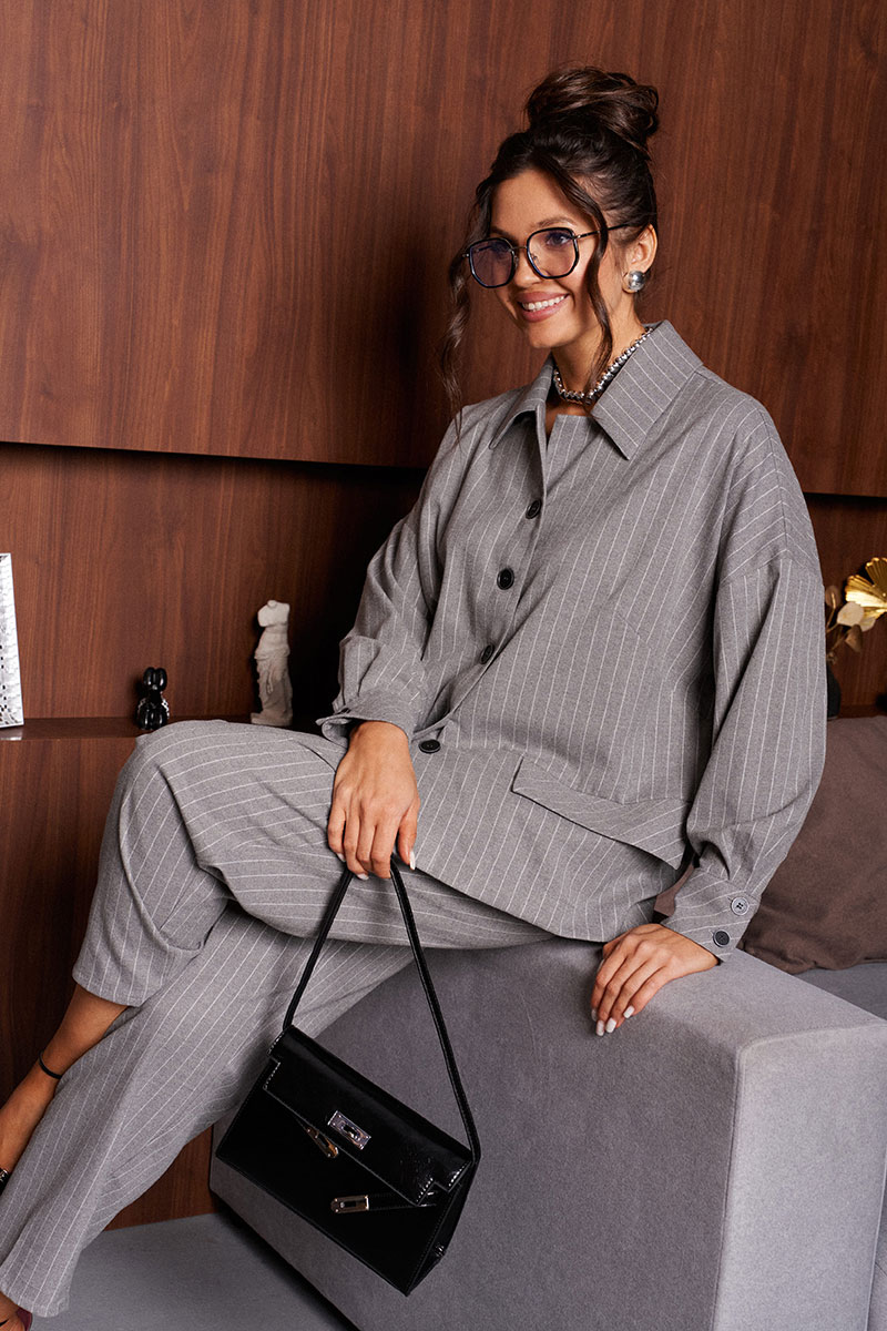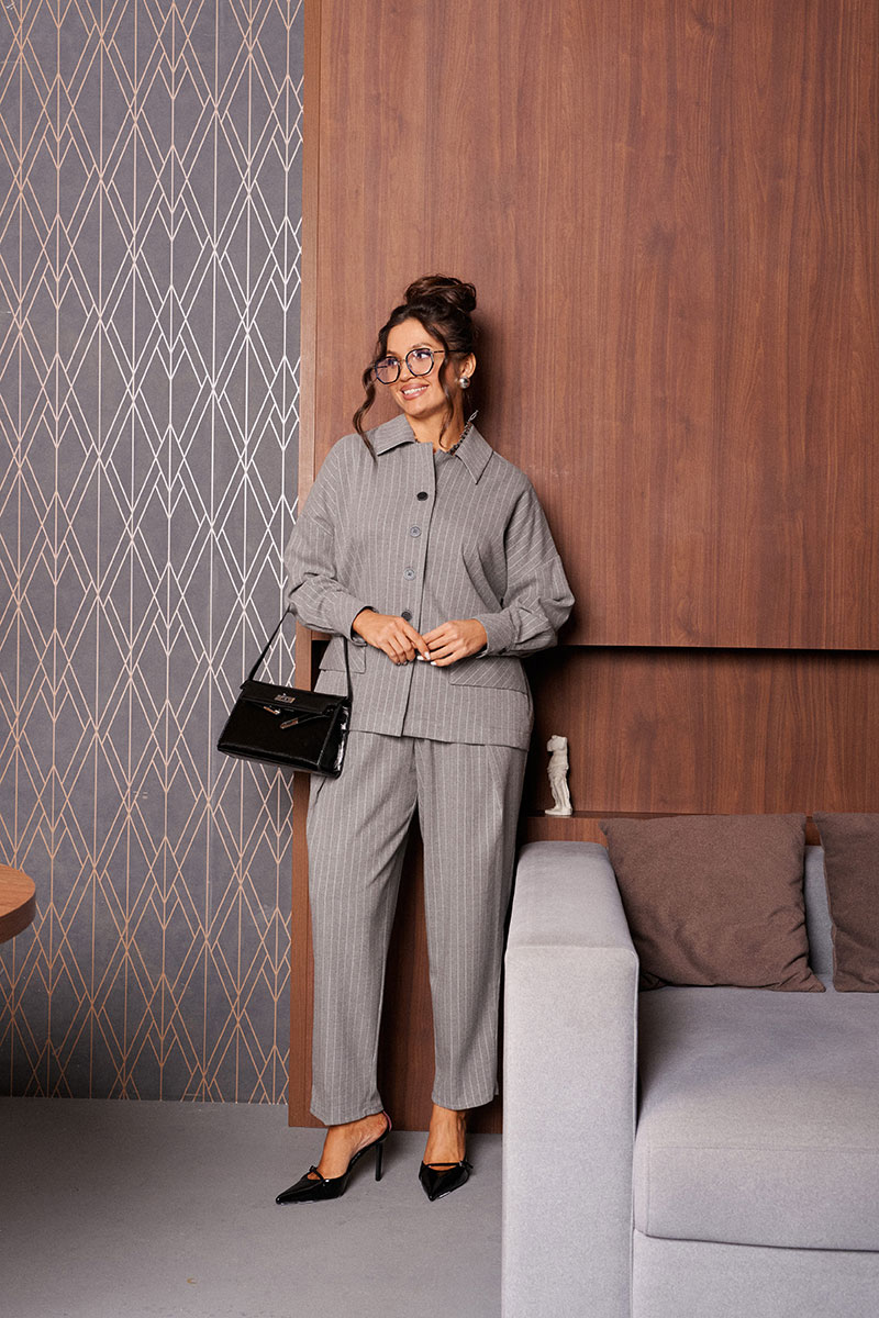 Костюм состоит из 2-предметов одежды: рубашки и брюк. Выполнен из костюмной ткани стильного дизайна в полоску.
