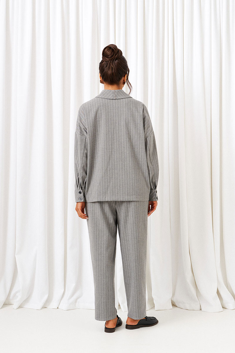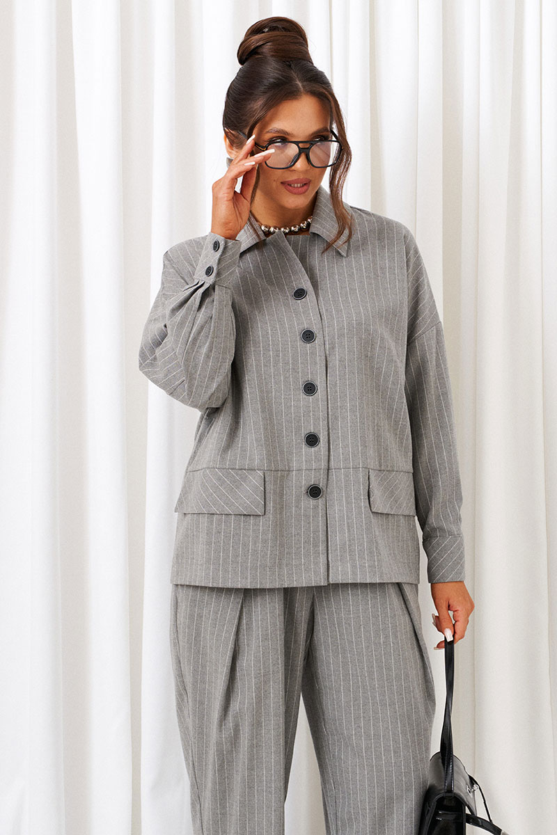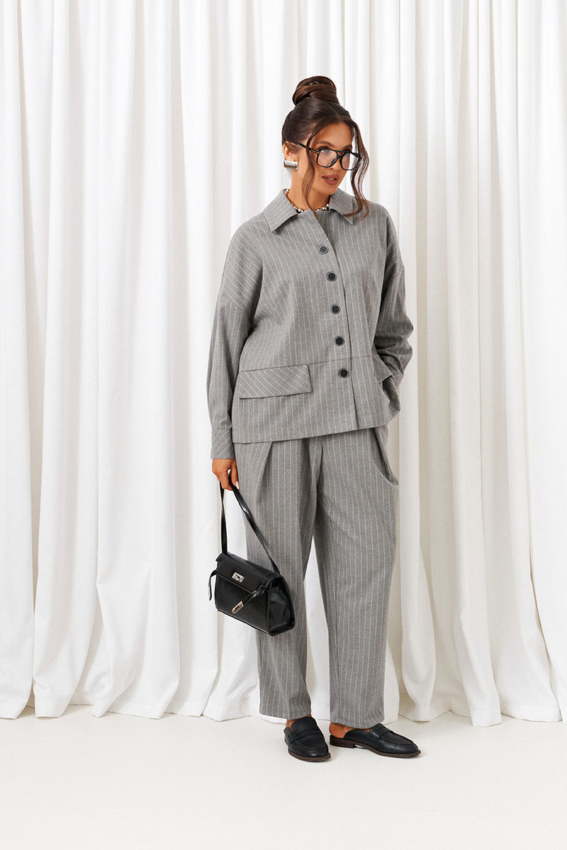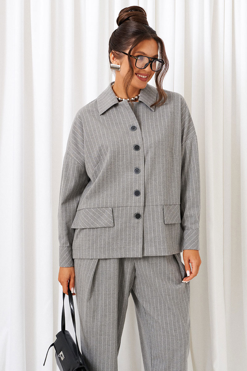 Костюм состоит из 2-предметов одежды: рубашки и брюк. Выполнен из костюмной ткани стильного дизайна в полоску.