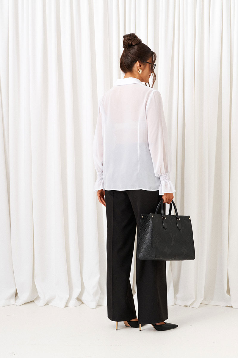 Блузка рубашечного типа выполнена из легкой, струящейся шифоновой ткани.
