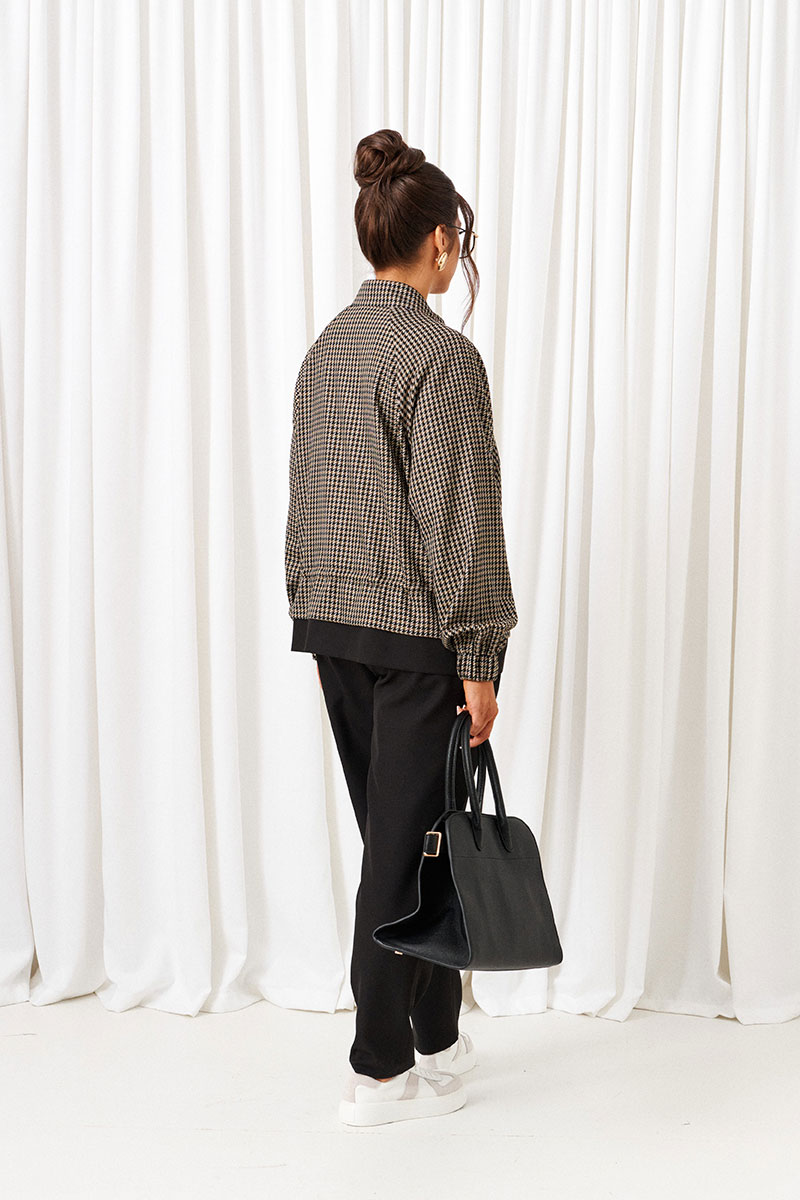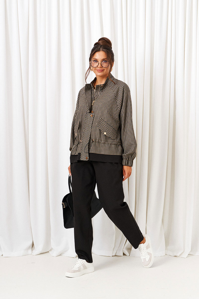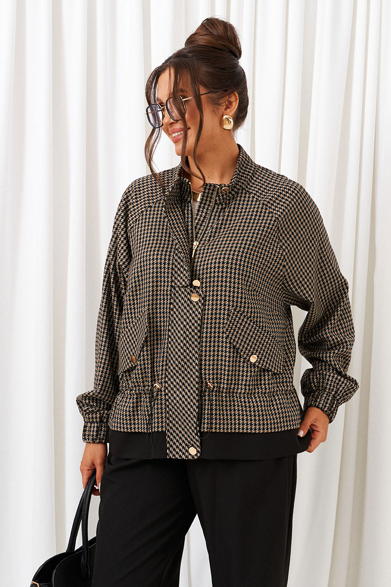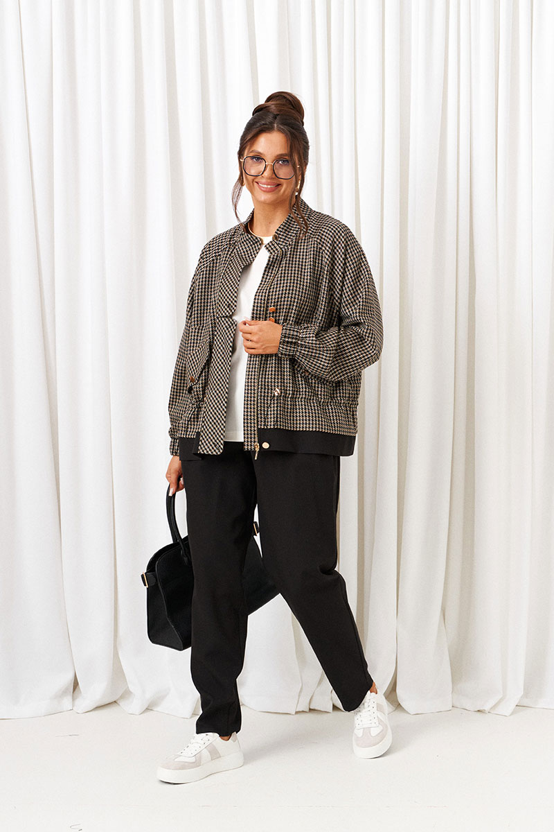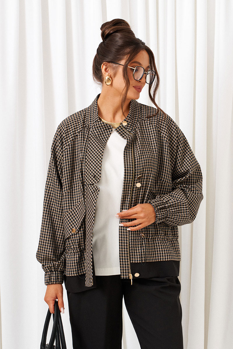 Жакет типа «бомбер» покроя «реглан», свободного силуэта с кулисой и шнуром-резинкой по талии.