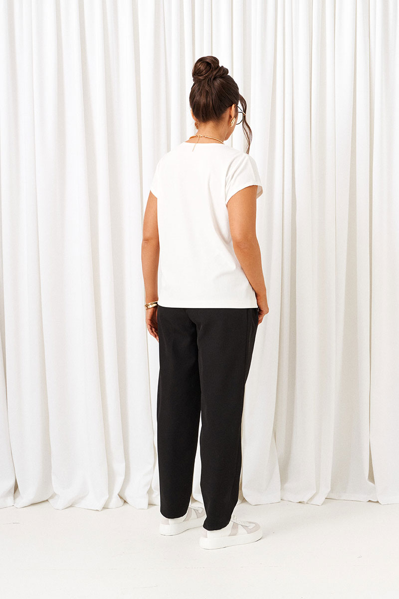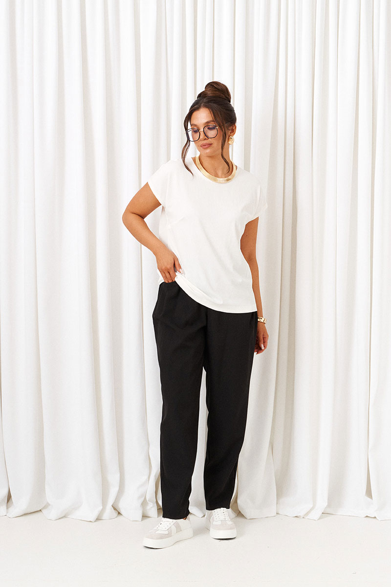 Брюки длинные, слегка заужены к низу; в спортивном стиле; выполнены из смесового костюмного полотна. Посадка классическая, высокая. Без застежки.