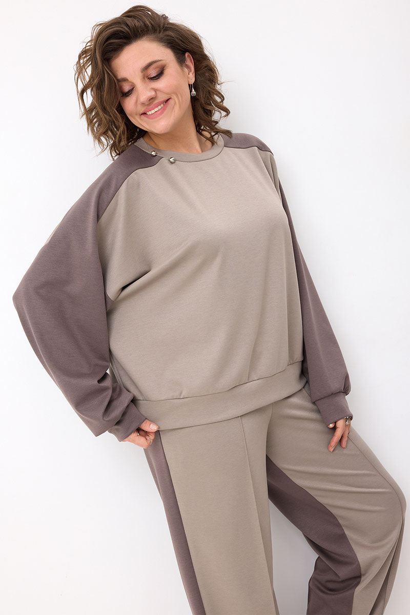 Свитшот свободного силуэта, горловина полукруглой формы обработана притачной обтачкой из основного материала, декорирована металлической брошью. Рукав реглан с манжетой по низу. Низ изделия обработан обтачкой. Брюки свободного силуэта, с застроченными стрелками. Пояс на резинке с островком для Вашего удобства. В боковых швах карманы «Хулиганы». Низ обработан классическим способом вподгибку.