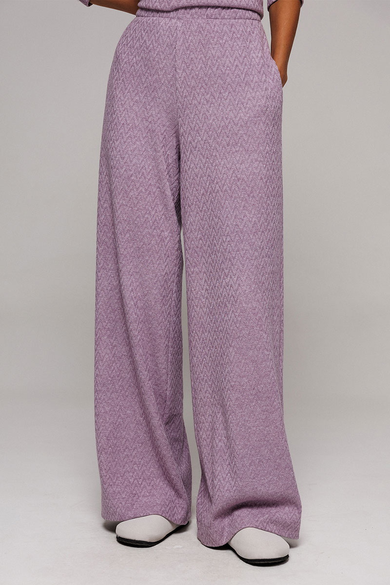 Брюки на притачном, отстроченном поясе с резинкой. Брюки от линии бедра слегка расширены к низу, с карманами в боковых швах.