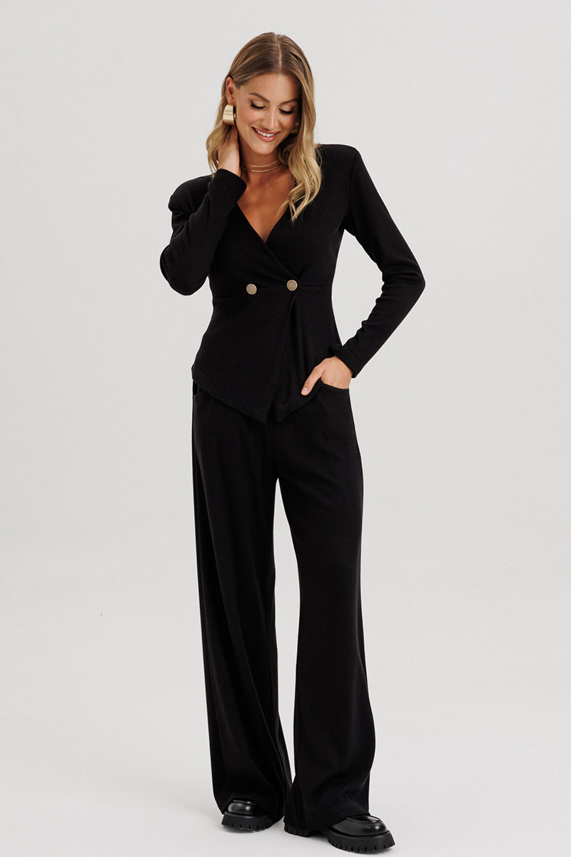 Брюки с поясом на резинке, расширены книзу. На передних половинках брюк обработаны округлые карманы.