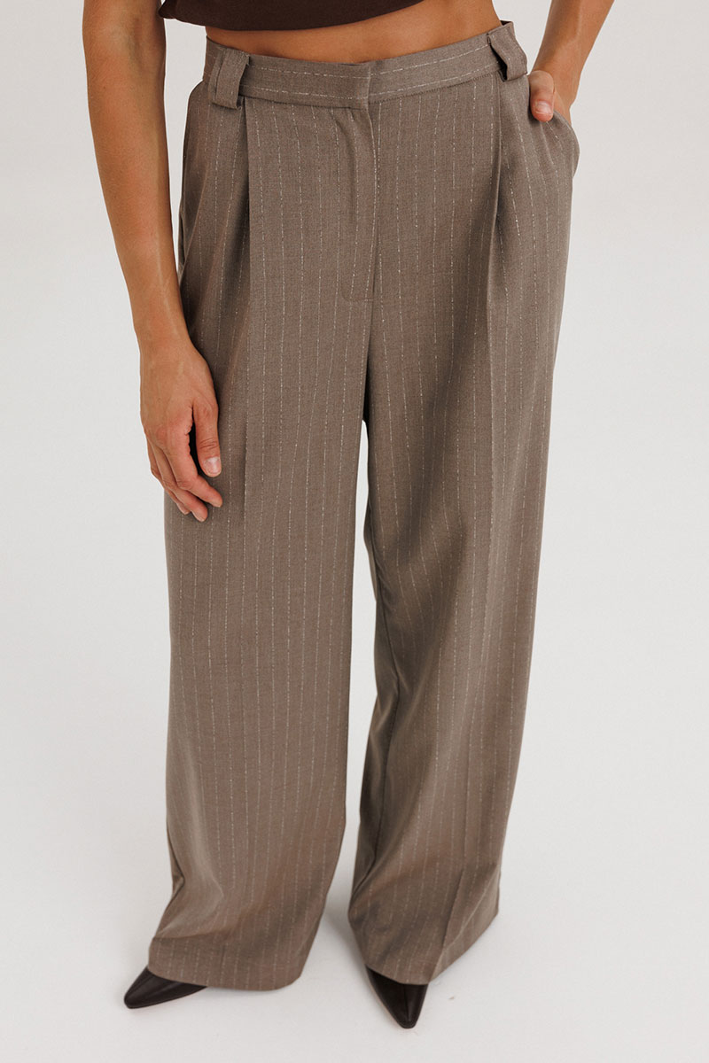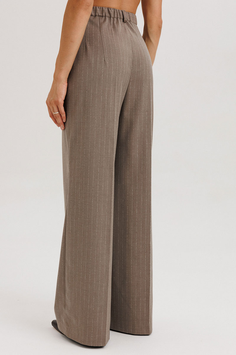 Брюки - палаццо с застежкой с гульфиком и откоском на тесьму-молнию; с притачным поясом с резинкой по спинке. Пояс со шлевками (2 широкие -по переду и 3 узких по спинке). Пояс застегивается на потайной крючок. Передние половинки брюк со складками и боковыми карманами. Задние половинки брюк с талиевыми вытачками.