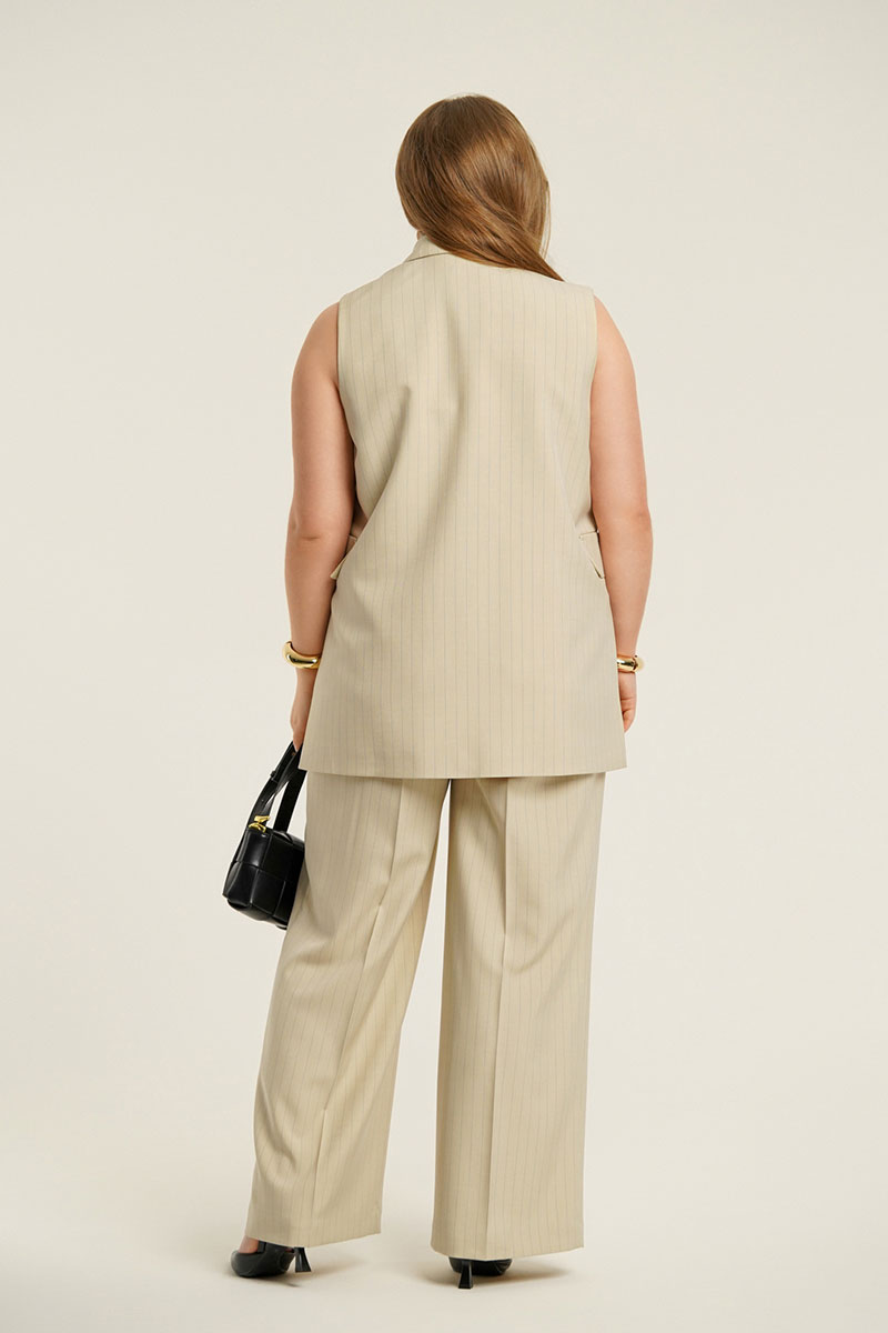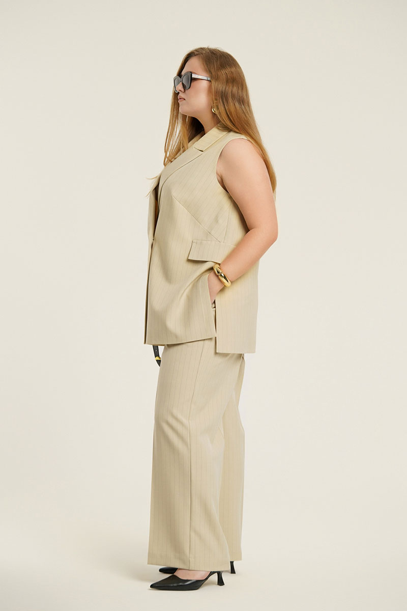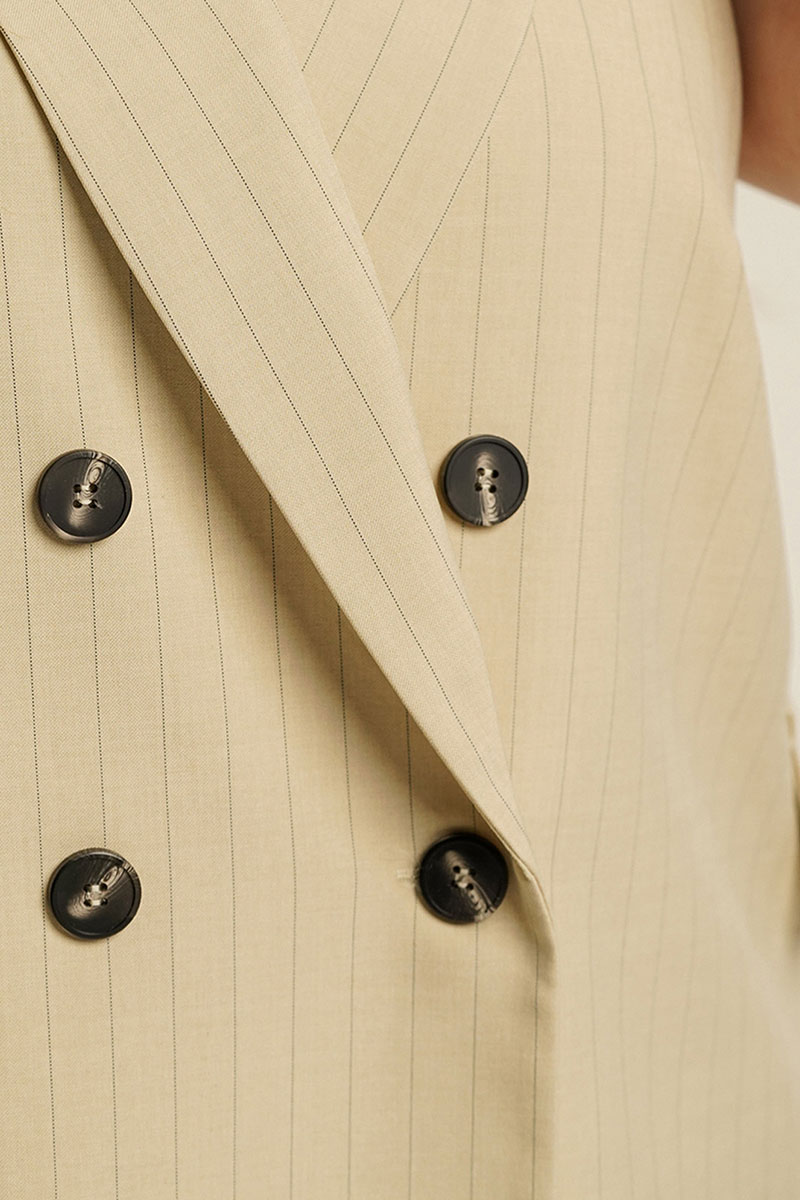 Жилет свободного покроя на подкладке. Воротник пиджачного типа, застежка двубортная на петли и пуговицы. Проймы аккуратные. В боковых швах шлицы. Клапаны переходят с переда на спинку.