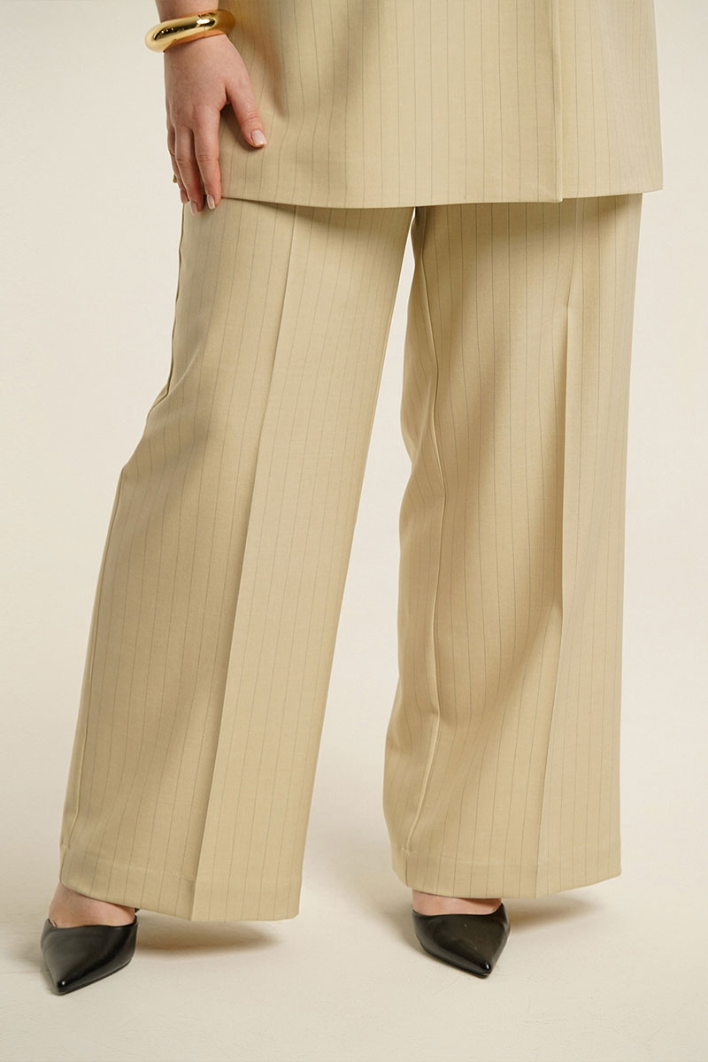 Брюки прямые от бедра. В боковых швах карманы с отрезным бочком. Застежка на молнию и петлю с пуговицей. Пояс отрезной, с вставкой эластичной тесьмы по спинке.