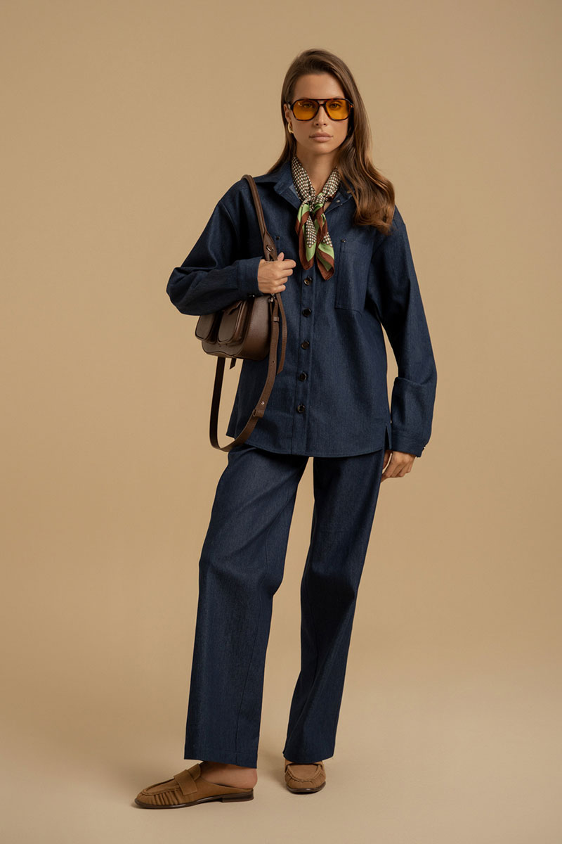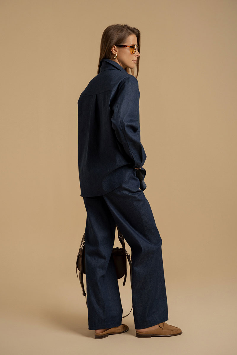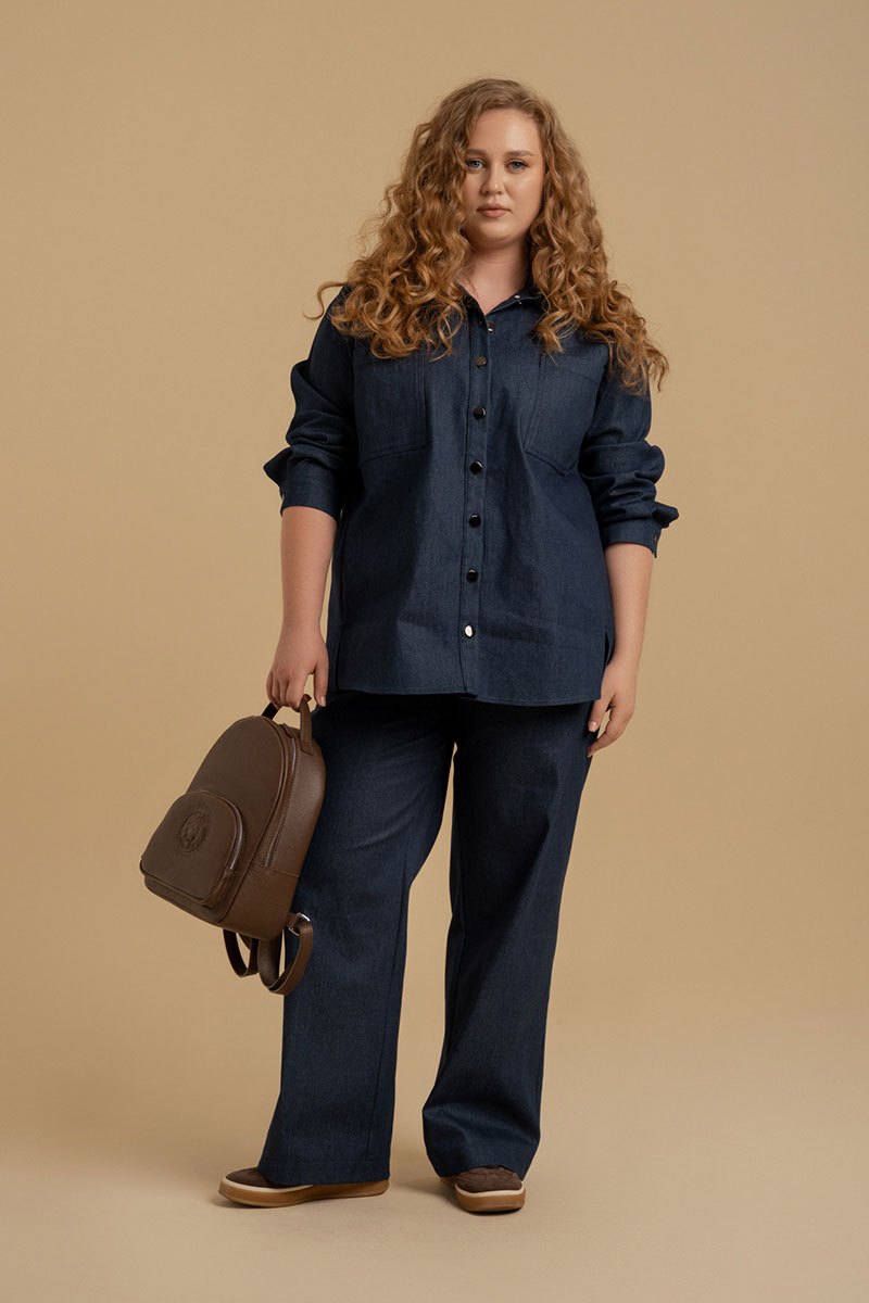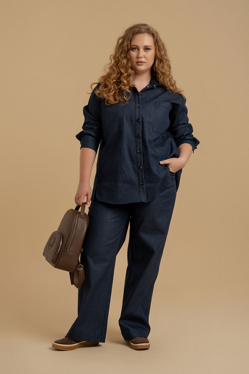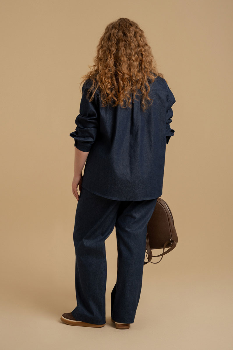 Брюки прямого силуэта. Пояс- отрезной с эластичной тесьмой и застежкой на петлю с пуговицей. Имеются карманы. На передних половинках - классической формы для джинсов, на задних половинках - настрочные. Есть шлевки для ремня.