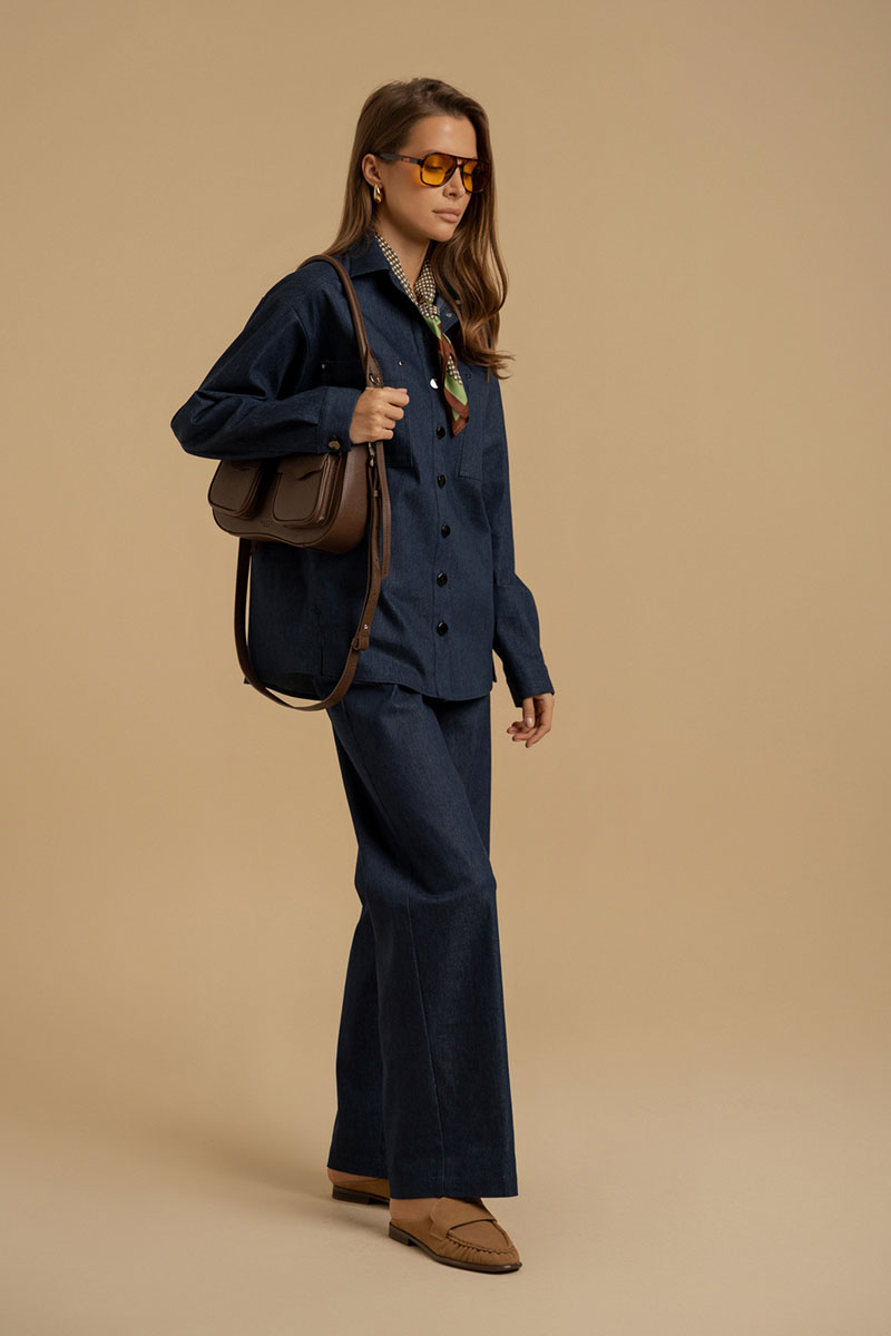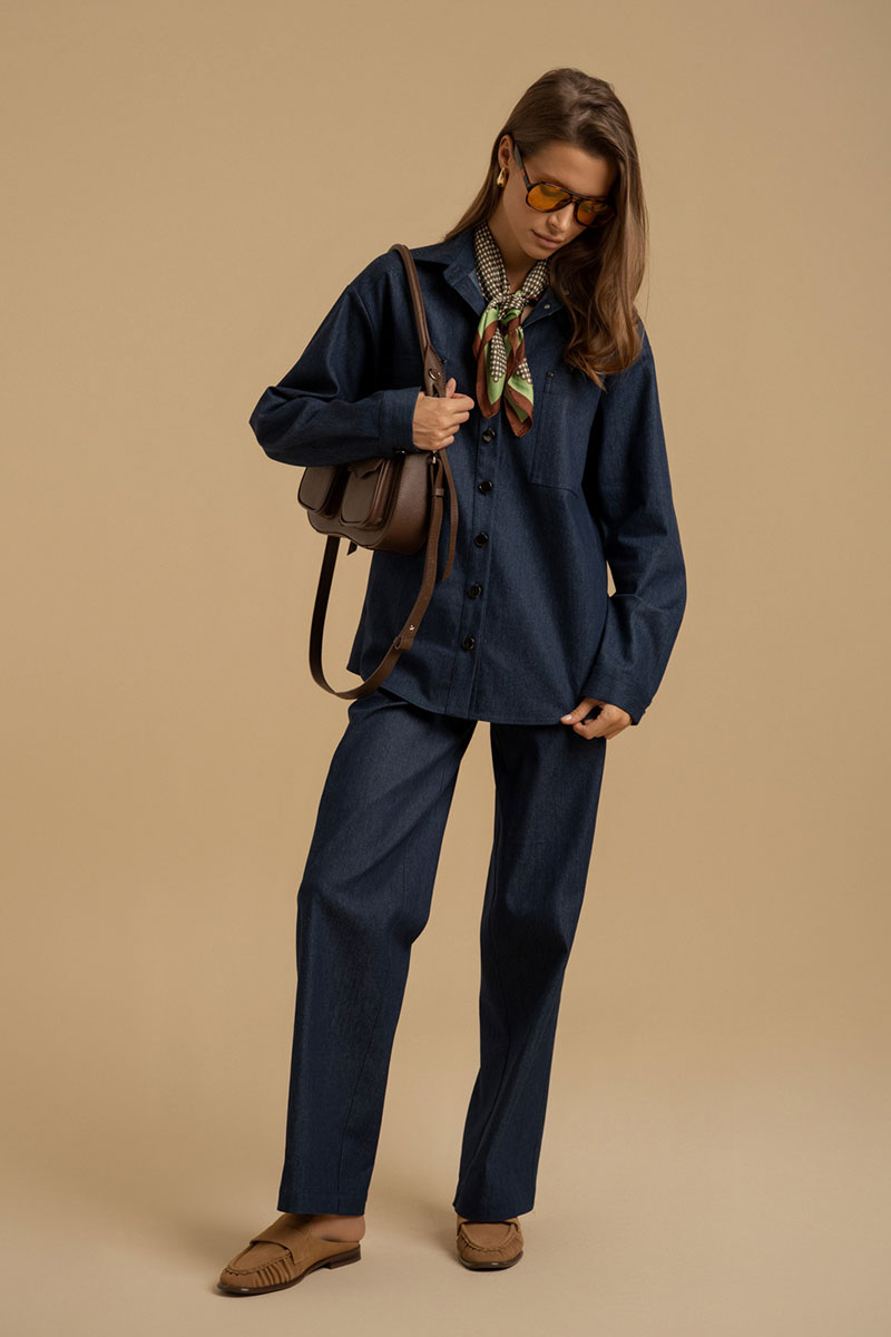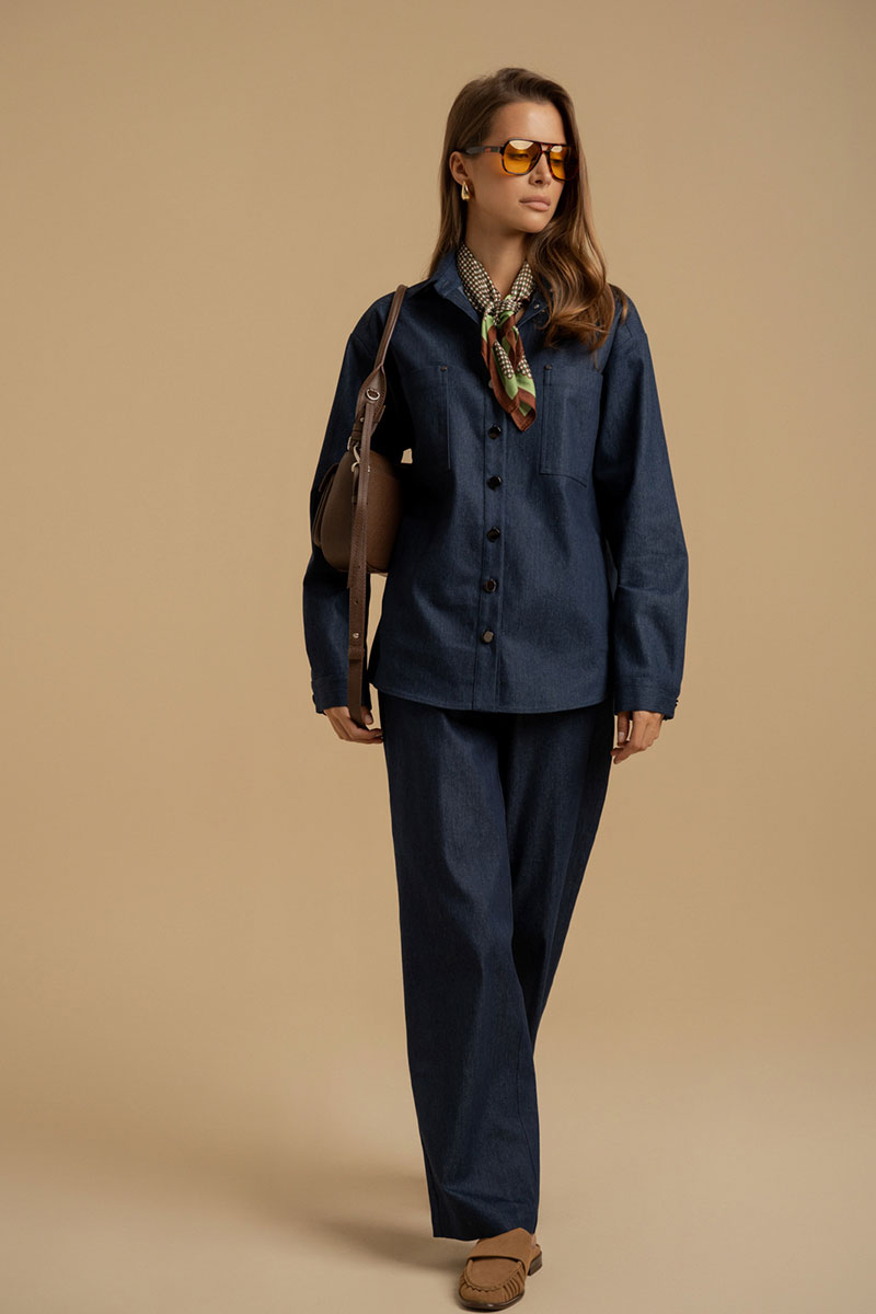 Блузка свободного покроя рубашечного типа. Вырез горловины оформлен отложным воротником с отрезной стойкой. Застежка - планка на петли с пуговицами. Рукава - втачные с опущенной линией плеча. Низа рукавов - отрезные манжеты. Боковые швы смещены вперед и имеют небольшие разрезы внизу и карманы. На передних половинках - настрочные карманы.