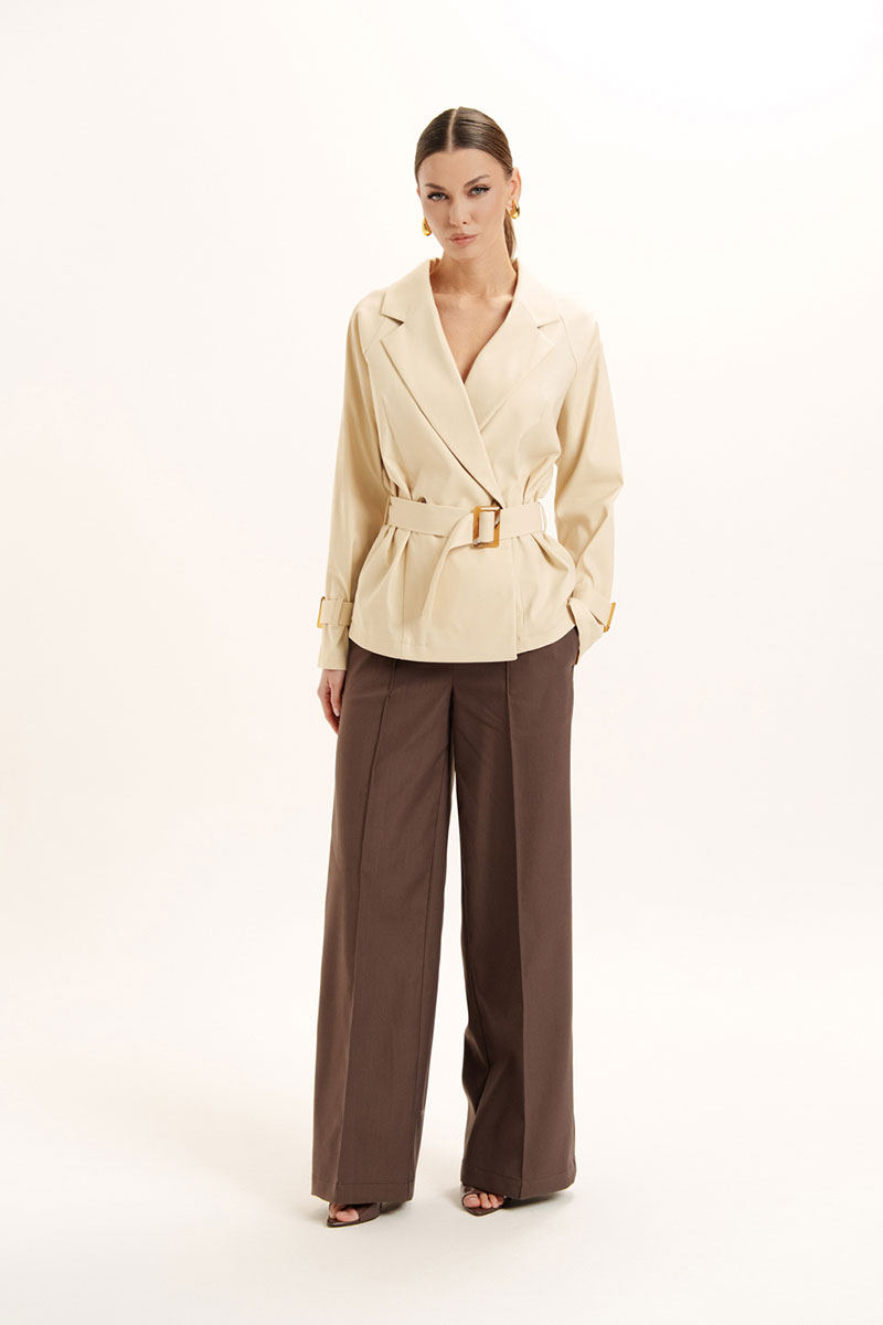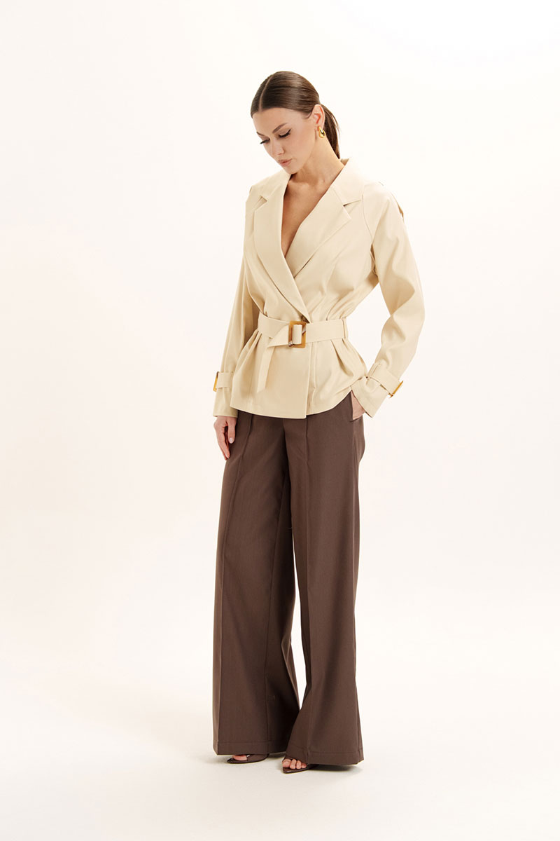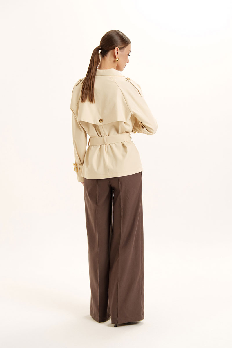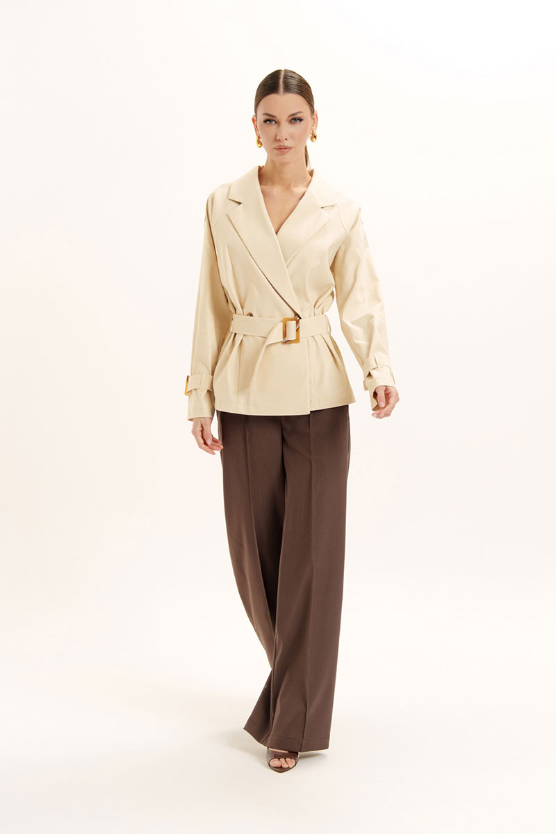 Жакет прямого силуэта с отлетной кокеткой по спинке и двубортной застежкой. Воротник пиджачного типа с лацканами и застежкой на петли и пуговицы. Рукав реглан, на плечевых швах обработаны хлястики с застежкой на петлю и пуговицу. По низу рукава пришиты шлевки и обработаны паты с декоративной пряжкой. В изделии есть съемный пояс, застежка на декоративную пряжку.