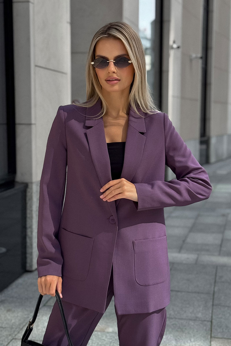 Жакет полуприлегающего силуэта, длинной ниже линии бедер. Спинка с таллиевыми вытачками и средним швом. Перед с нагрудными вытачками, переведенными в линии плечевого шва и накладными карманами. Жакет с центрально-бортовой застежкой на одну петлю-пуговицу и воротником пиджачного типа. Жакет на подкладке. Рукава втачные, двух-шовные , стандартной длины.