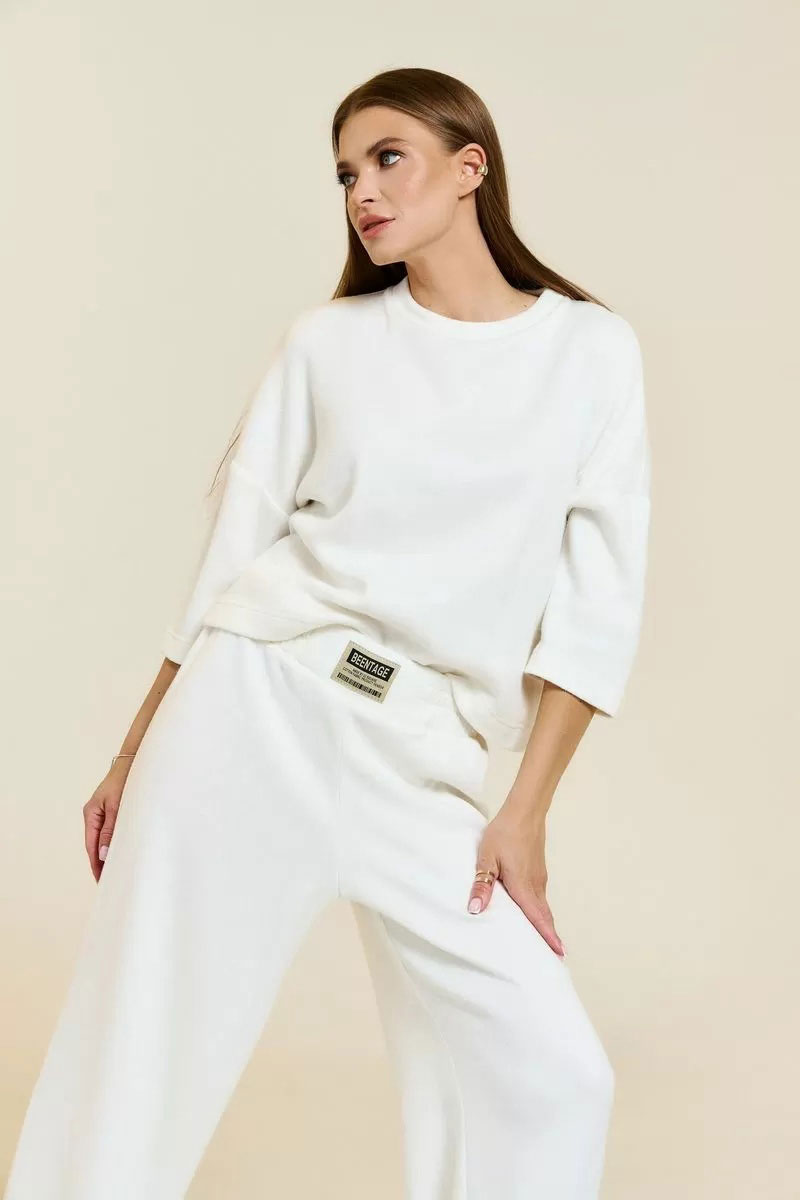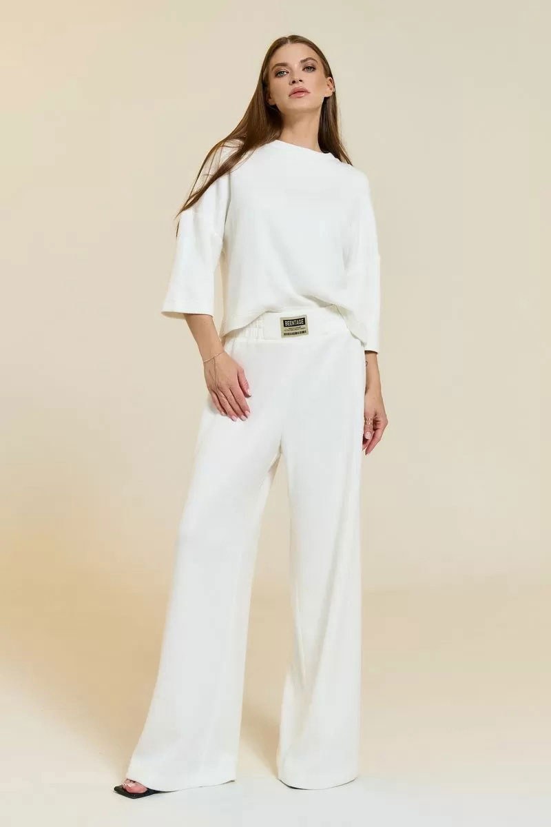 Брюки прямого покроя "палаццо". Пояс стачной, на центральную часть пояса настрочена нашивка. По эластичной тесьме проложены 2 отделочные фиксирующие строчки. Низ джемпера, низ рукавов и низ брюк подшит на плоскошовной машине