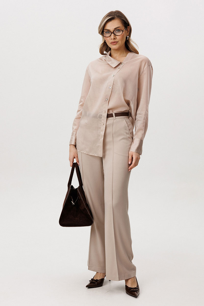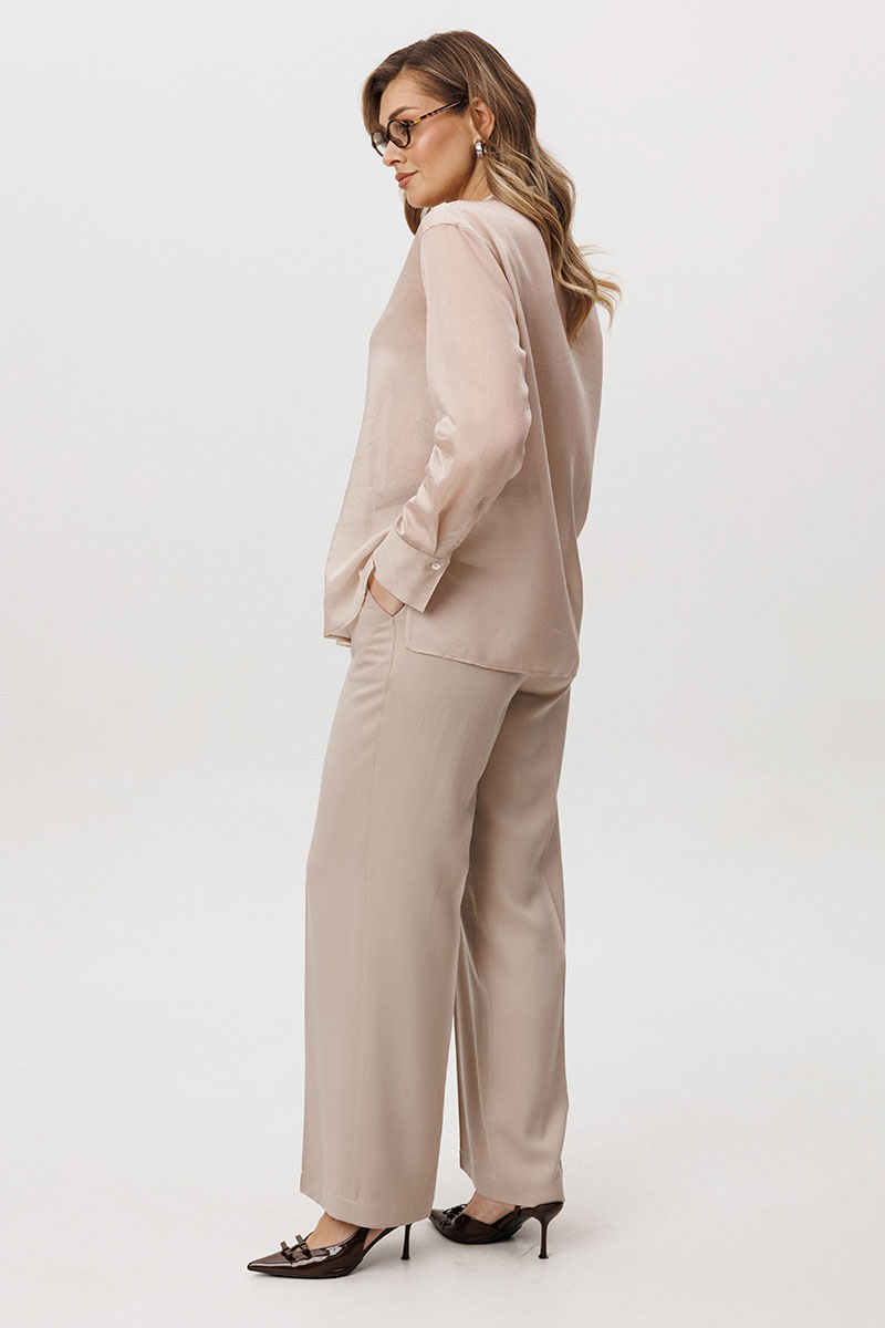 Великолепная двойка: брюки и блуза в одном цвете, но из разнофактурных материалов. Нарочитая женственность, подчеркнутая полупрозрачностью верха и пластичностью брюк.