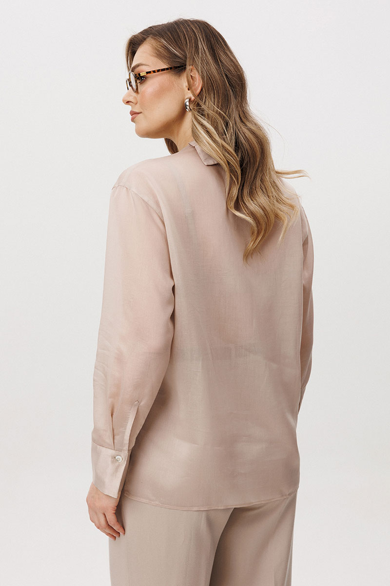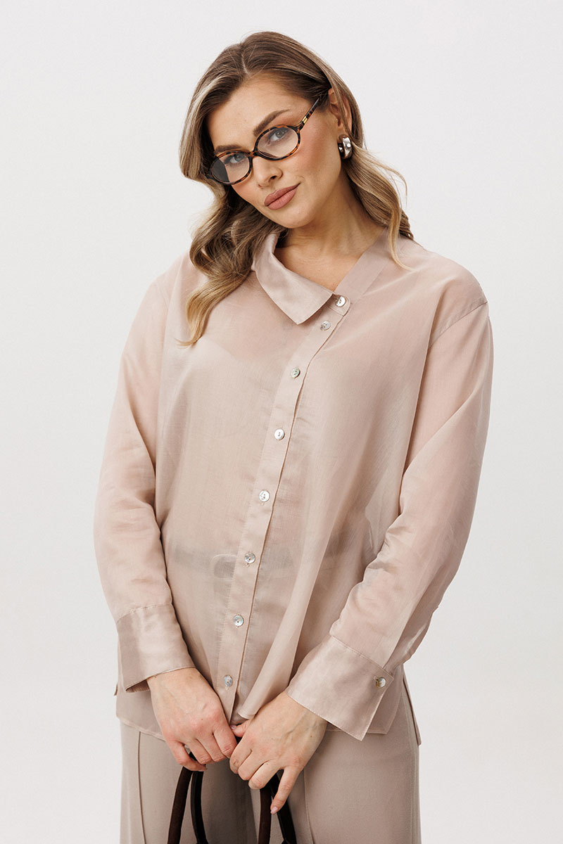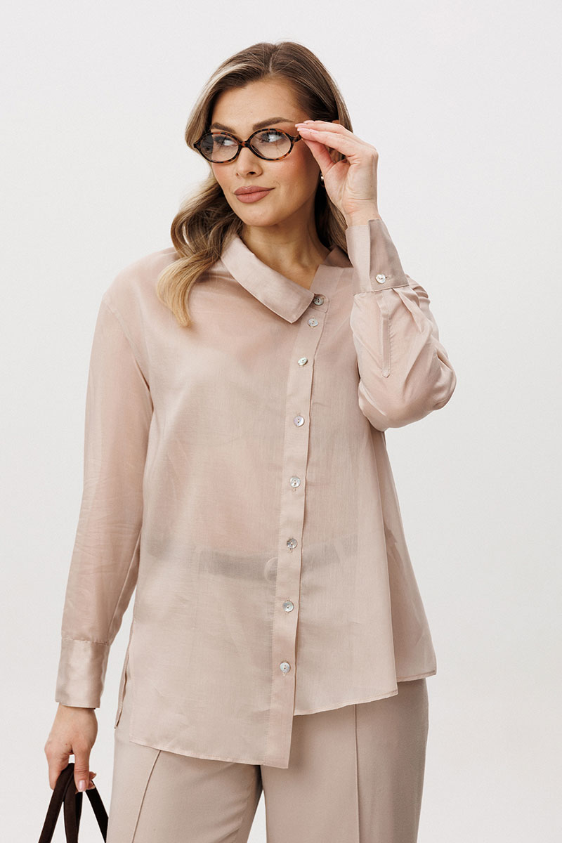 Блуза свободного кроя с рубашечным рукавом, ассиметричной застёжкой, разноуровневым низом, рубашечным воротником.