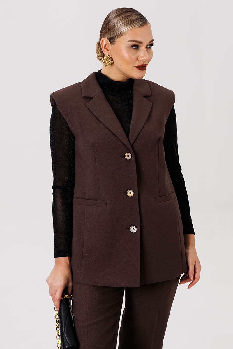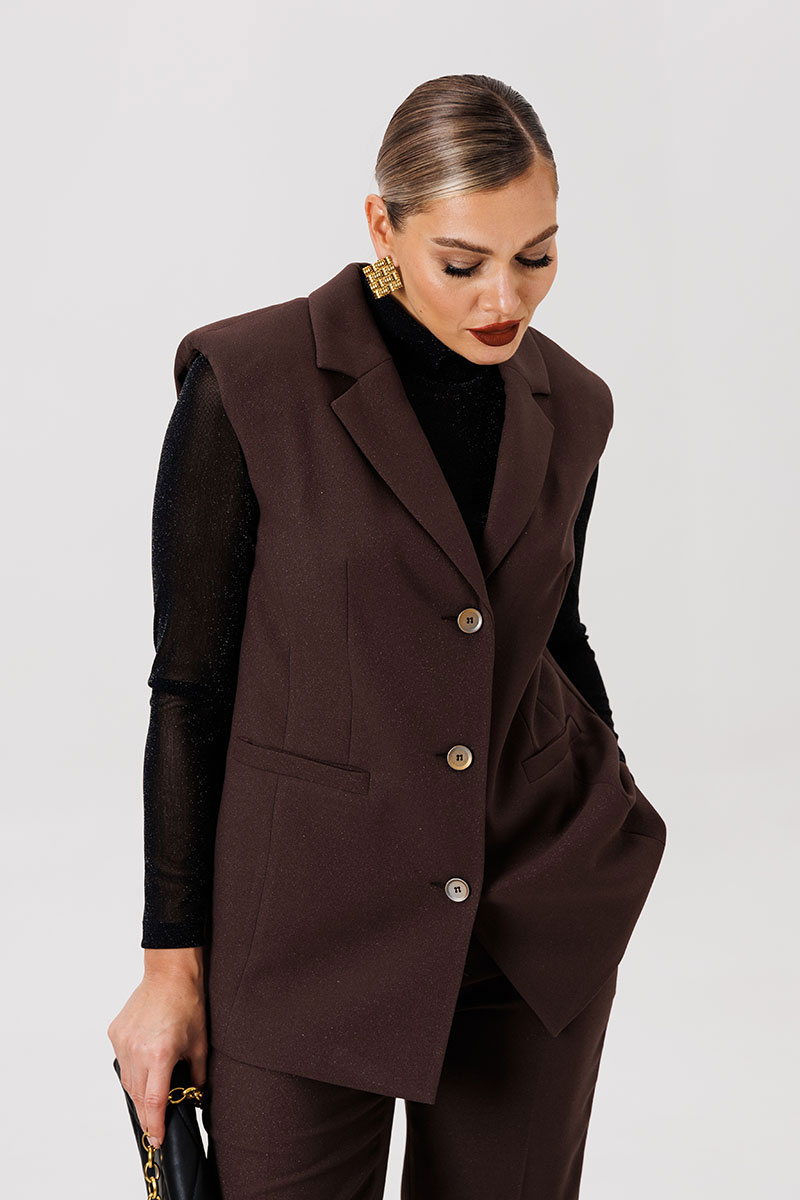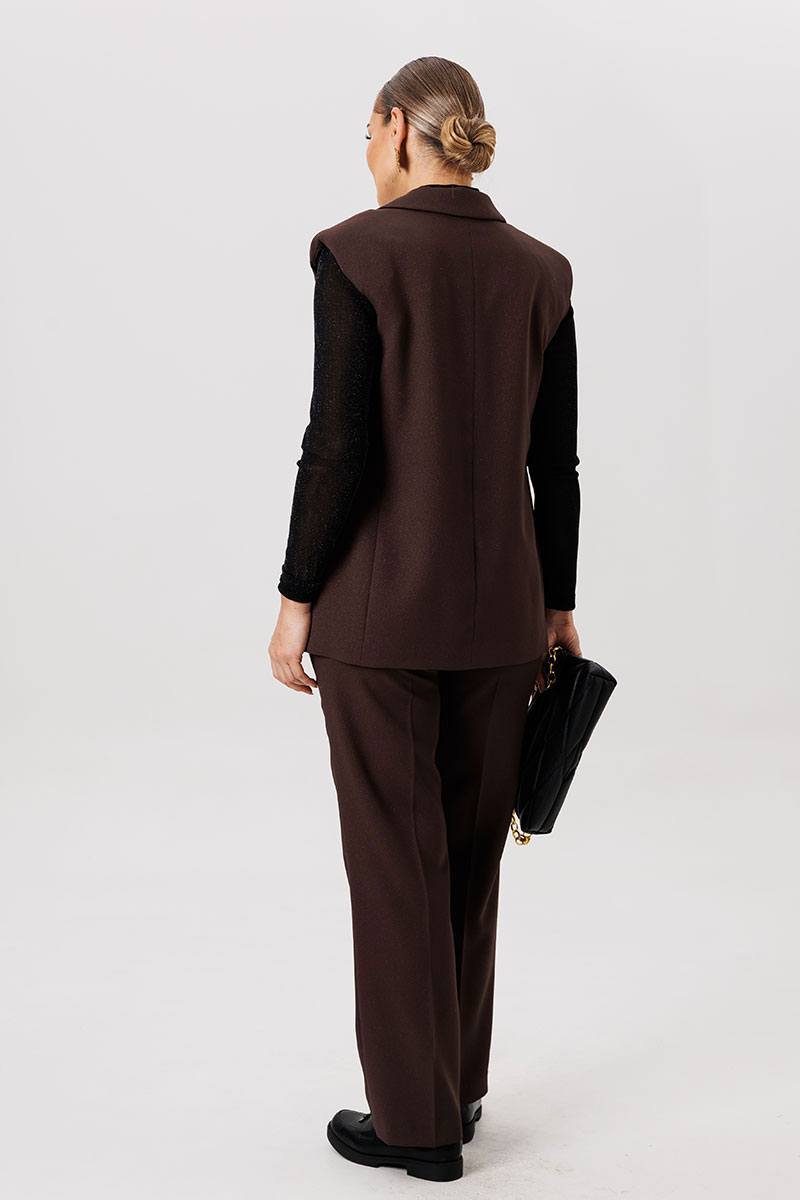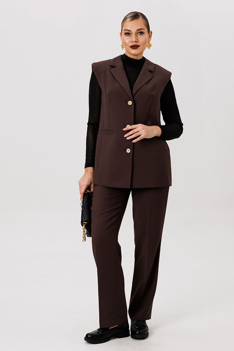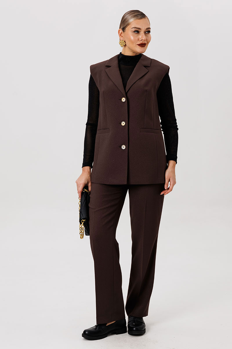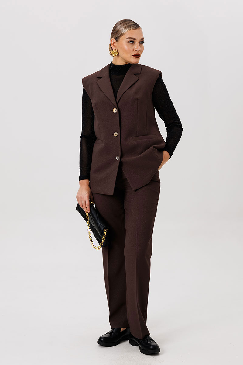 Полуприлегающий удлинённый жилет и прямые брюки отлично подчёркивают фигуру, а слегка расширенные плечи жилета придают дополнительную изюминку образу.