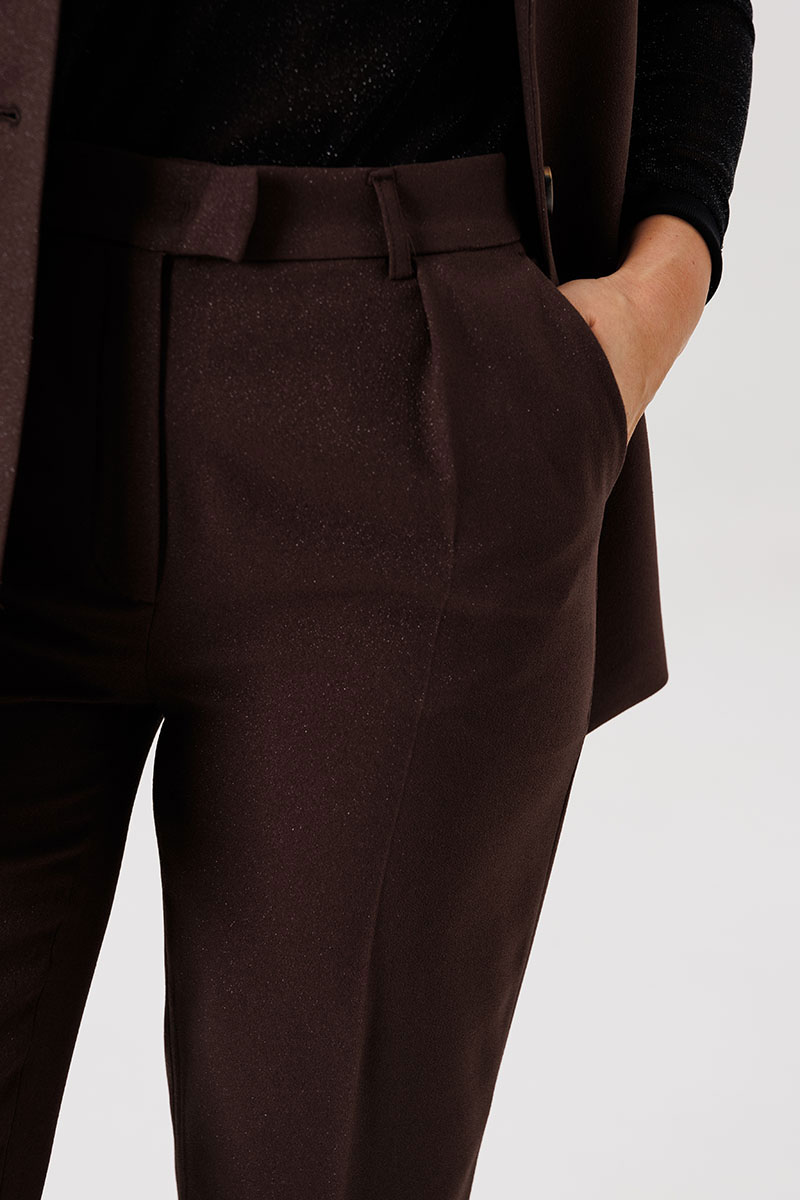 Брюки классического покроя с наклонными боковыми карманами, защипами по передним половинкам, застёжкой на потайной брючный крючок и молнию. Брюки на притачном поясе со шлёвками, эластичном в области спинки.