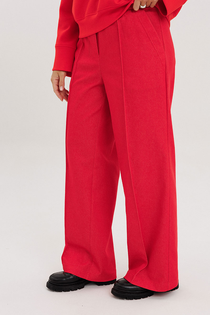 Брюки в расслабленном стиле, на эластичном поясе с наклонными боковыми карманами и кантом-защипом по передним половинкам брюк.