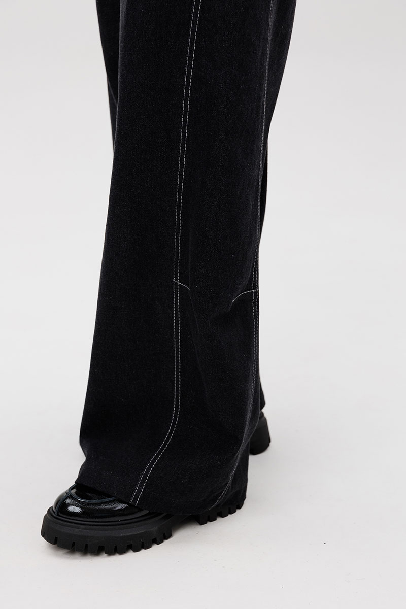 Брюки baggy из денима, с интересным худящим эффектом, достигаемым за счет отрезной боковой части, смещенной на передних и задних половинках.