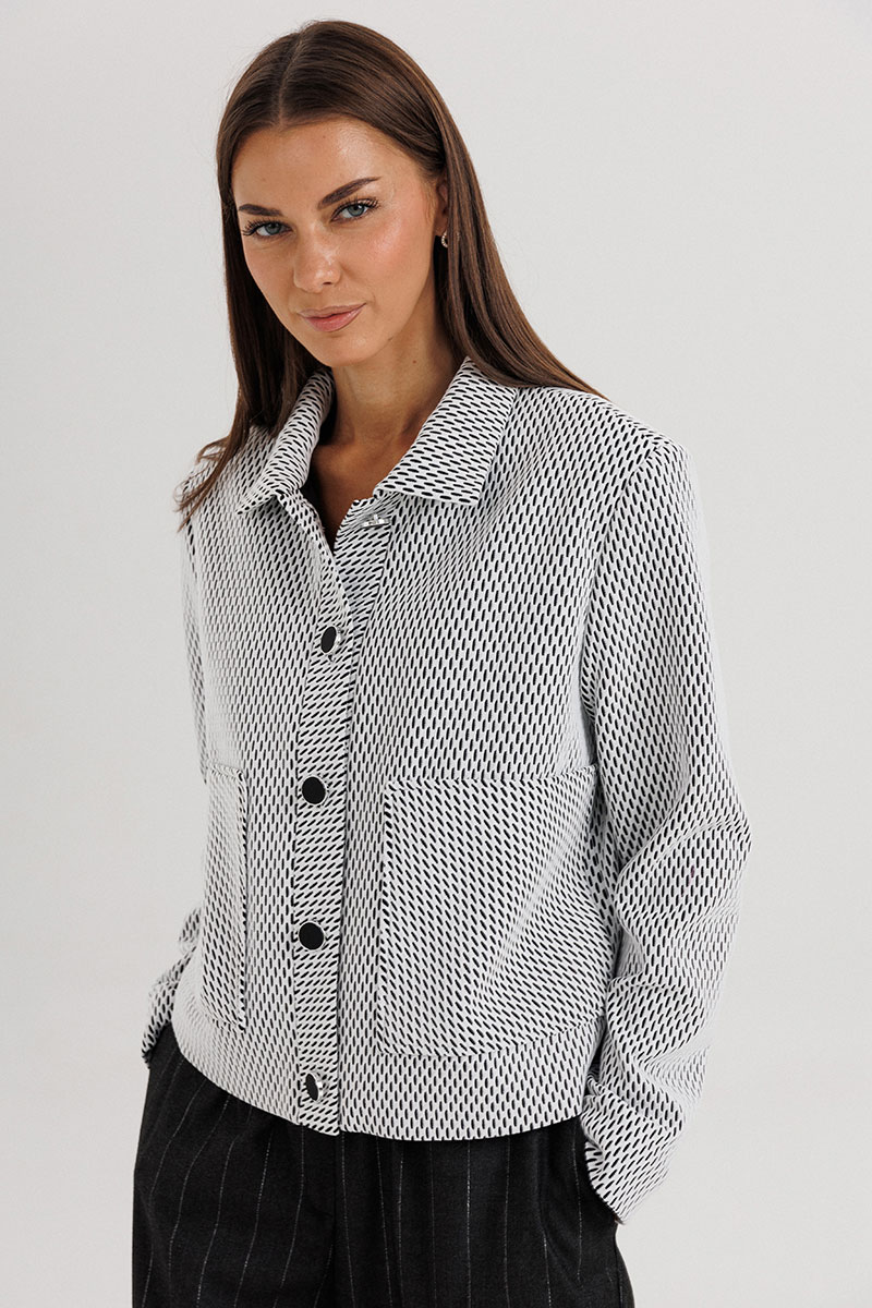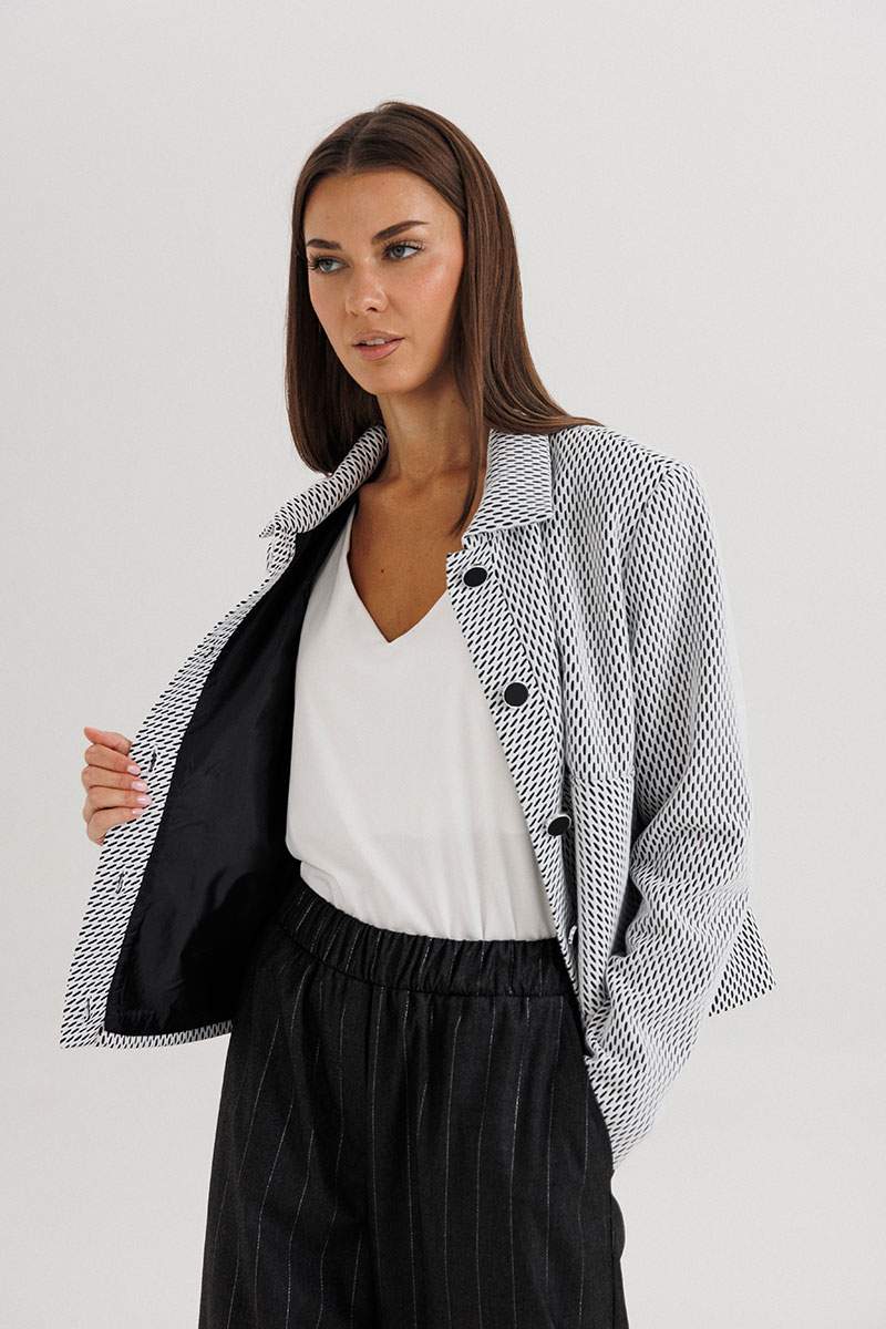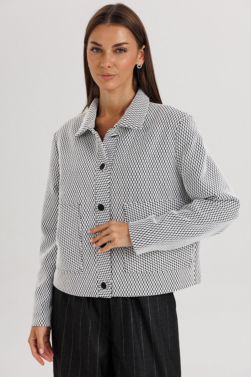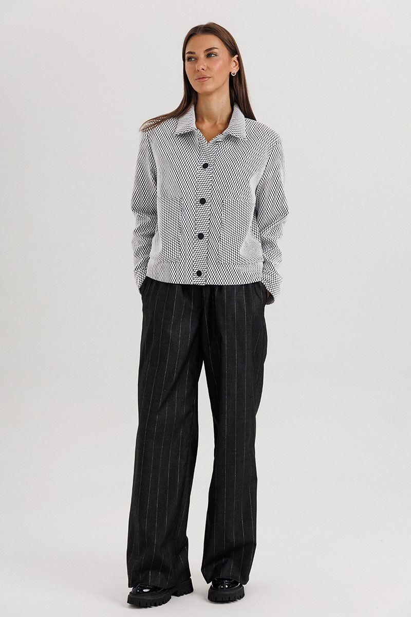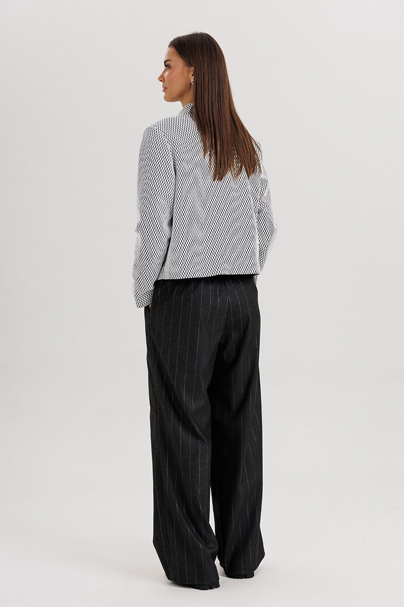 Жакет укороченной длины выполнен из лёгкой ткани с графическим узором, имеет отложной воротник и аккуратную застёжку на пуговицы. Брюки прямого силуэта со стрелками и комфортной посадкой по талии визуально вытягивают силуэт и добавляют стройности.