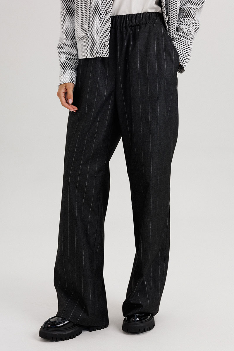 Современный женский костюм в стиле smart casual сочетает элегантность классики и комфорт повседневного образа. Комплект состоит из жакета прямого кроя с крупными пуговицами и брюк в тонкую вертикальную полоску. Контраст текстур придаёт образу динамичность и стиль.