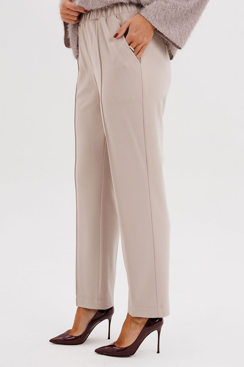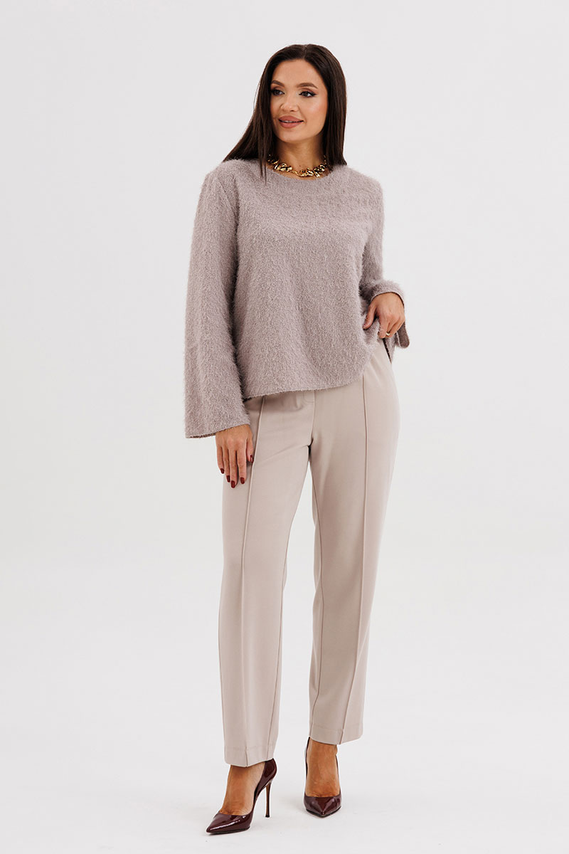 Блуза выполнена из нежного трикотажа с лёгким ворсом — материал красиво драпируется и придаёт образу уют. Брюки классического кроя с высокой посадкой и застроченными стрелками визуально вытягивают силуэт и создают безупречную посадку.
