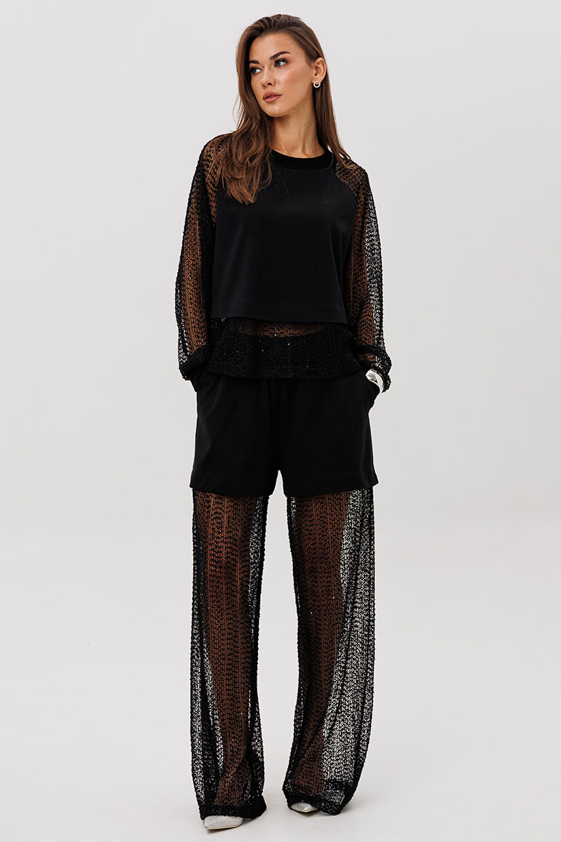 Современный брючный комплект, который создаёт эффект многослойности и лёгкого сияния.