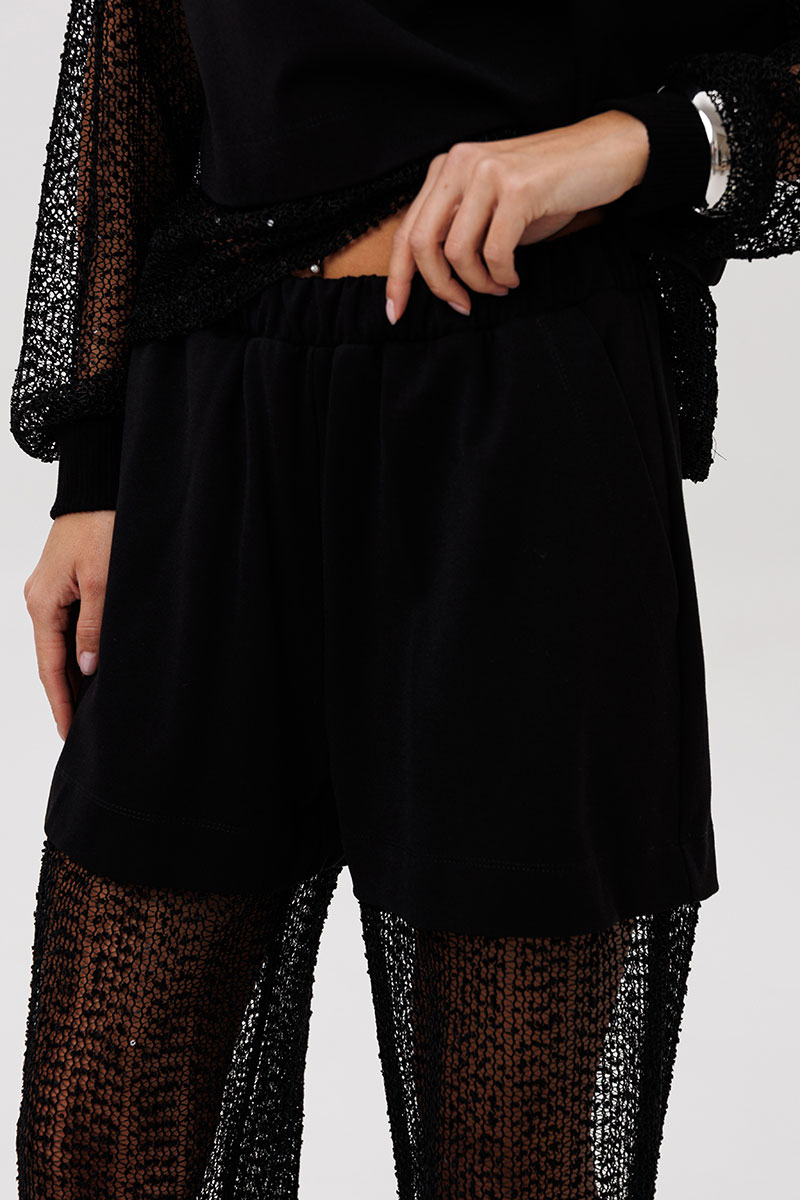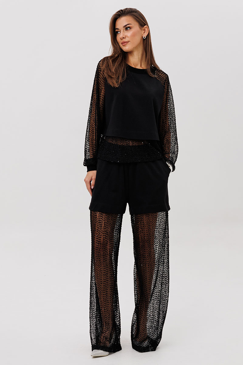 Брюки на удобном эластичном поясе имеют прозрачную нижнюю часть в тон — подвижную, блестящую и подчёркивающую силуэт. Стильное решение для тех, кто ценит тренды и оригинальное звучание образа.