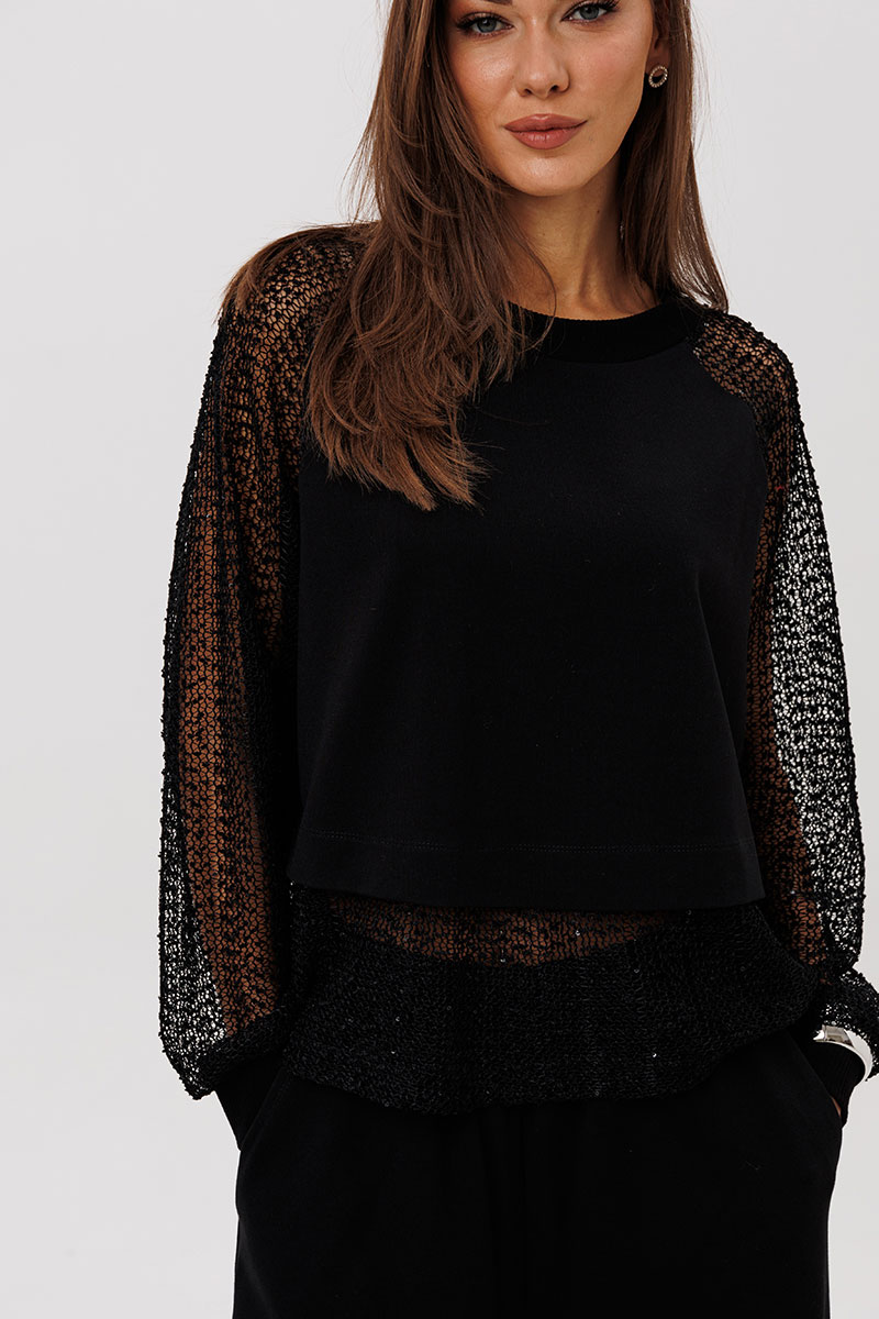 Джемпер выполнен из мягкого, комфортного вискозного полотна с нейлоном и дополнен воздушными рукавами из мерцающей сетки с россыпью микропайетки.