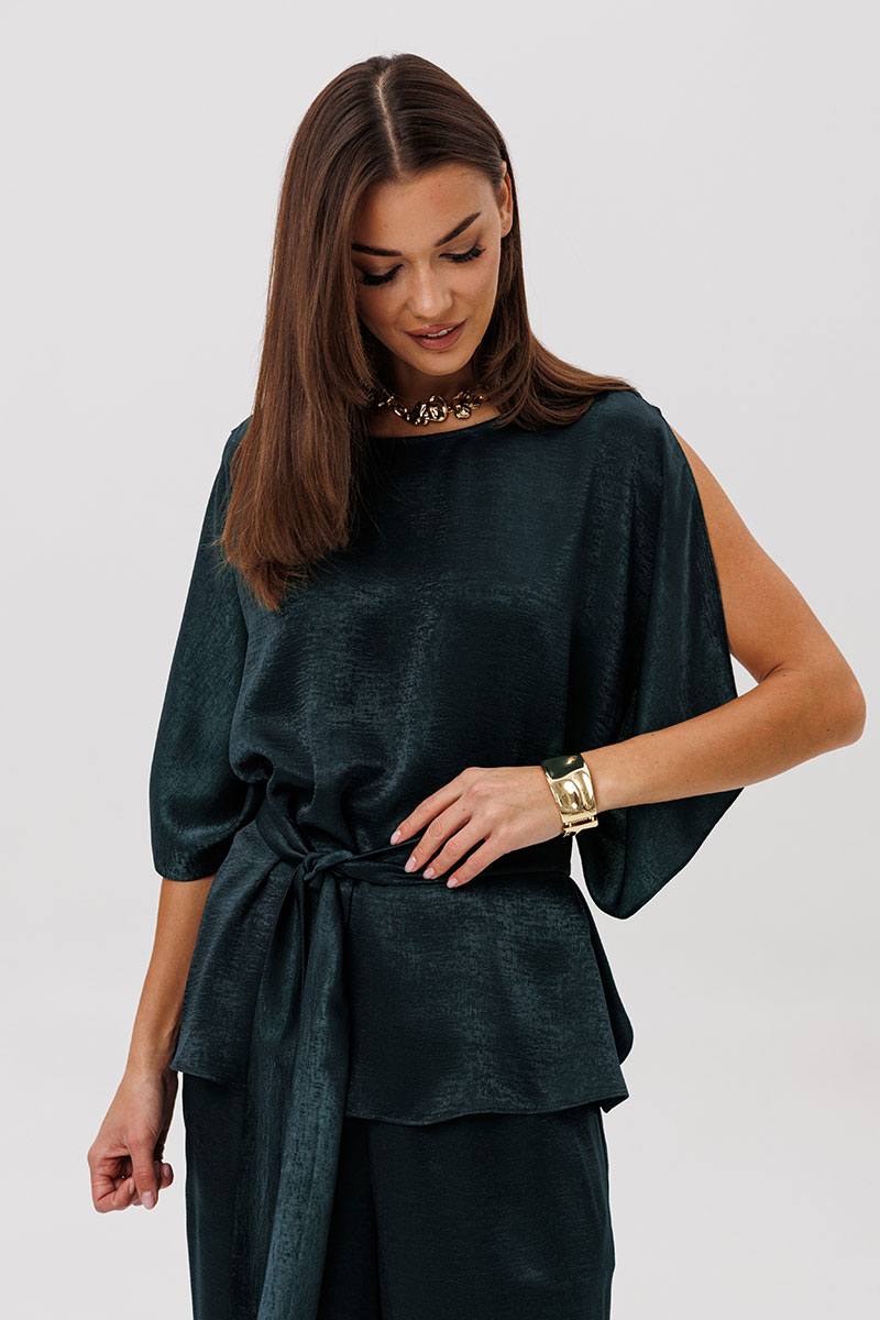 Свободная блуза beautifully драпируется, мягко играет на свету и позволяет носить её как в расслабленном варианте, так и подчёркивая талию поясом.