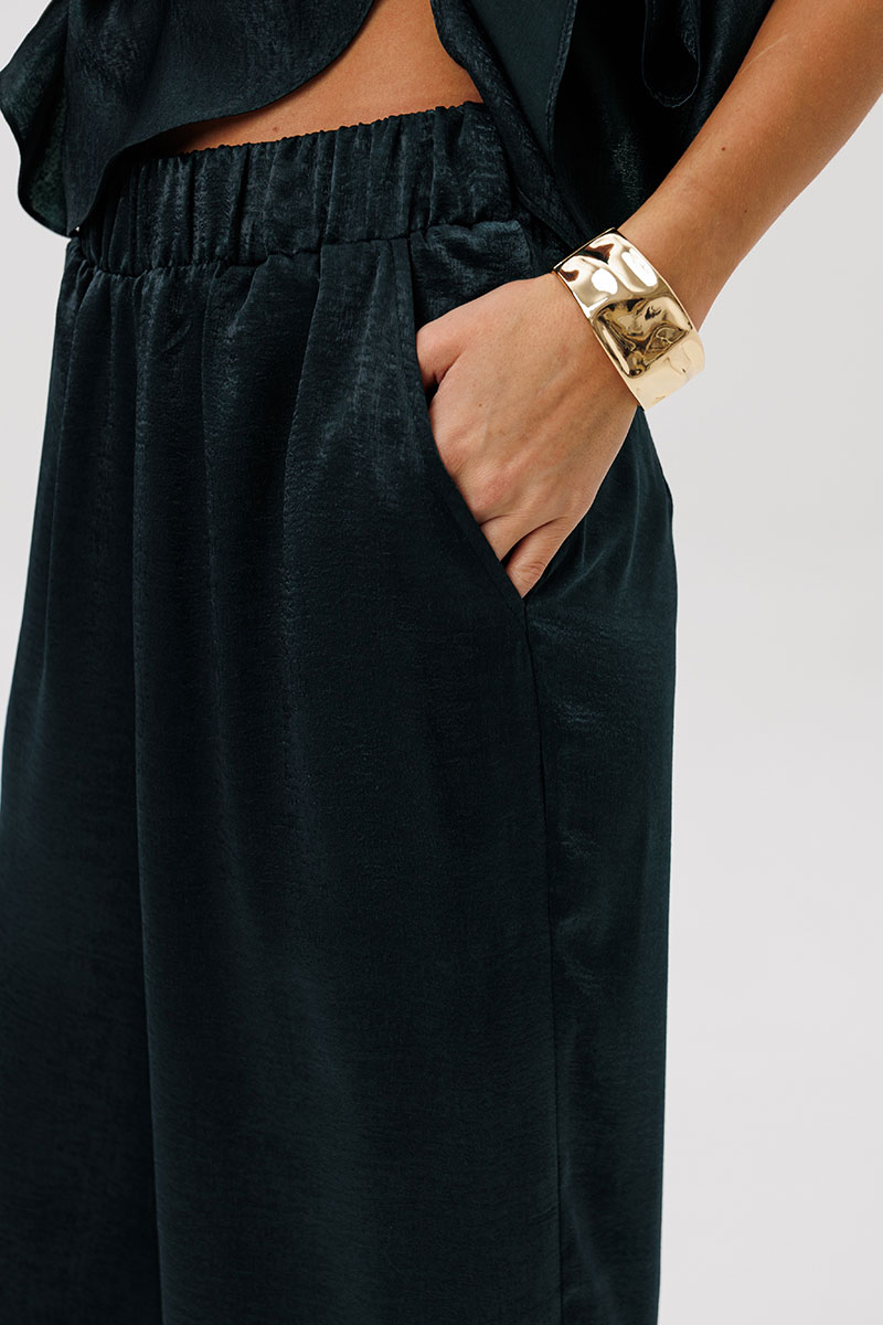 Широкие брюки на комфортной резинке создают эффект удлинённых ног и дарят полную свободу движений.