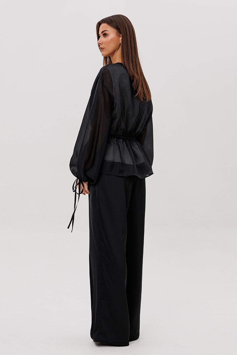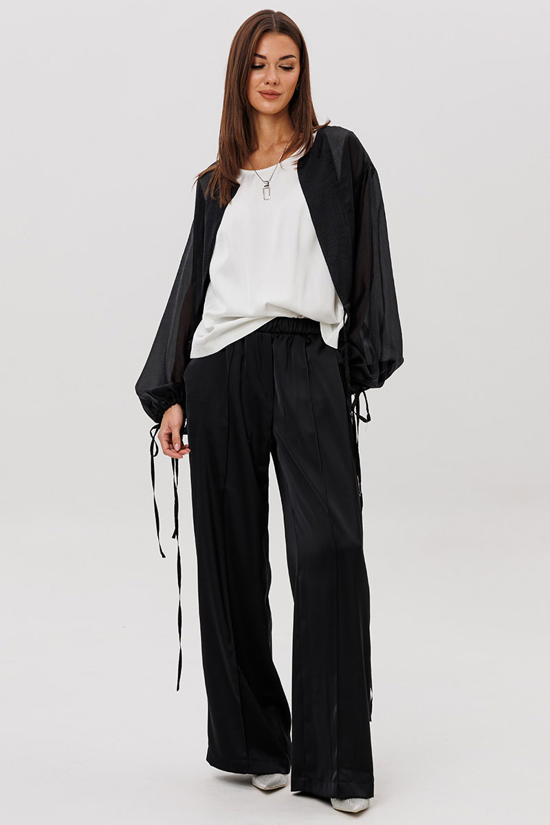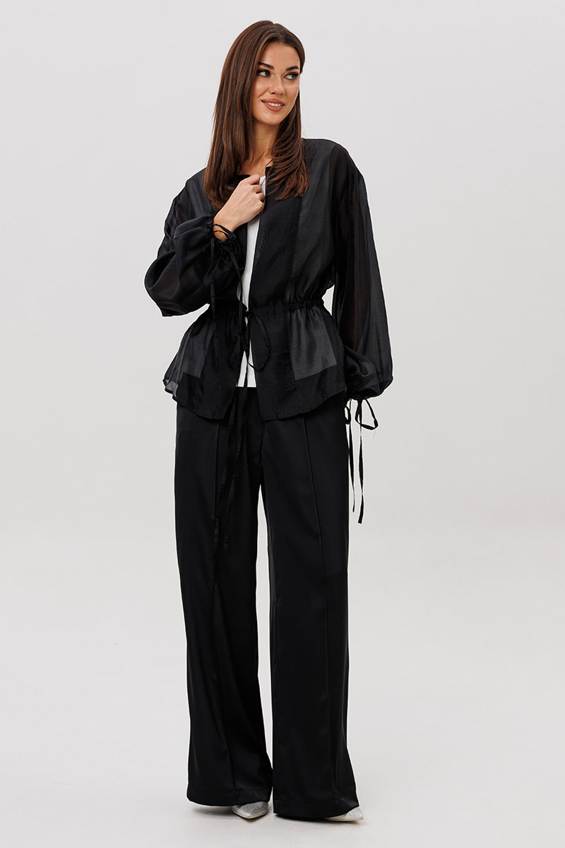 Эффектный ансамбль-тройка, в котором каждая деталь работает на утончённый и современный образ. Полупрозрачный блузон из воздушной вискозной органзы создаёт легкую дымку и добавляет образу благородной загадочности, а акцентные завязки подчёркивают талию и делают силуэт более выразительным. Контрастный атласный топ вносит нотку сияния и гармонично освежает тёмную гамму комплекта. Широкие атласные брюки со стрелкой и комфортным эластичным поясом добавляют образу сдержанной элегантности и подчёркивают его продуманную роскошность.
