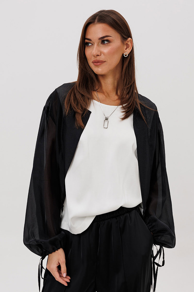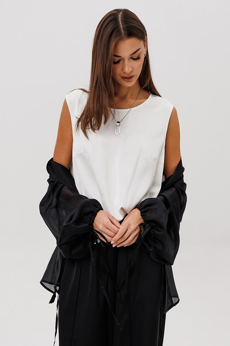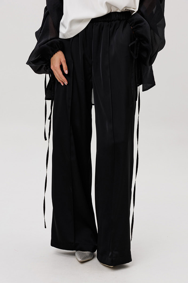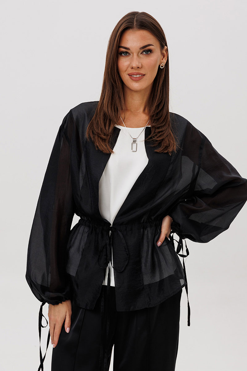 Эффектный ансамбль-тройка, в котором каждая деталь работает на утончённый и современный образ. Полупрозрачный блузон из воздушной вискозной органзы создаёт легкую дымку и добавляет образу благородной загадочности, а акцентные завязки подчёркивают талию и делают силуэт более выразительным. Контрастный атласный топ вносит нотку сияния и гармонично освежает тёмную гамму комплекта. Широкие атласные брюки со стрелкой и комфортным эластичным поясом добавляют образу сдержанной элегантности и подчёркивают его продуманную роскошность.