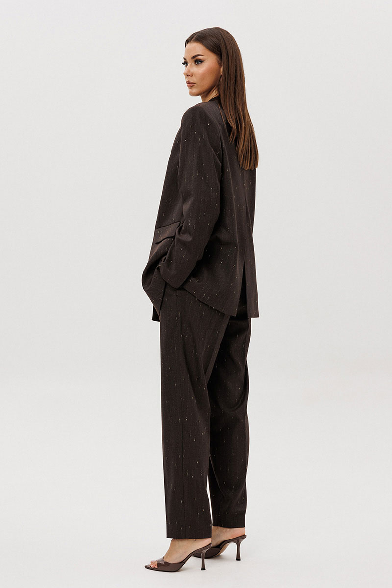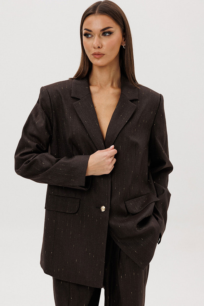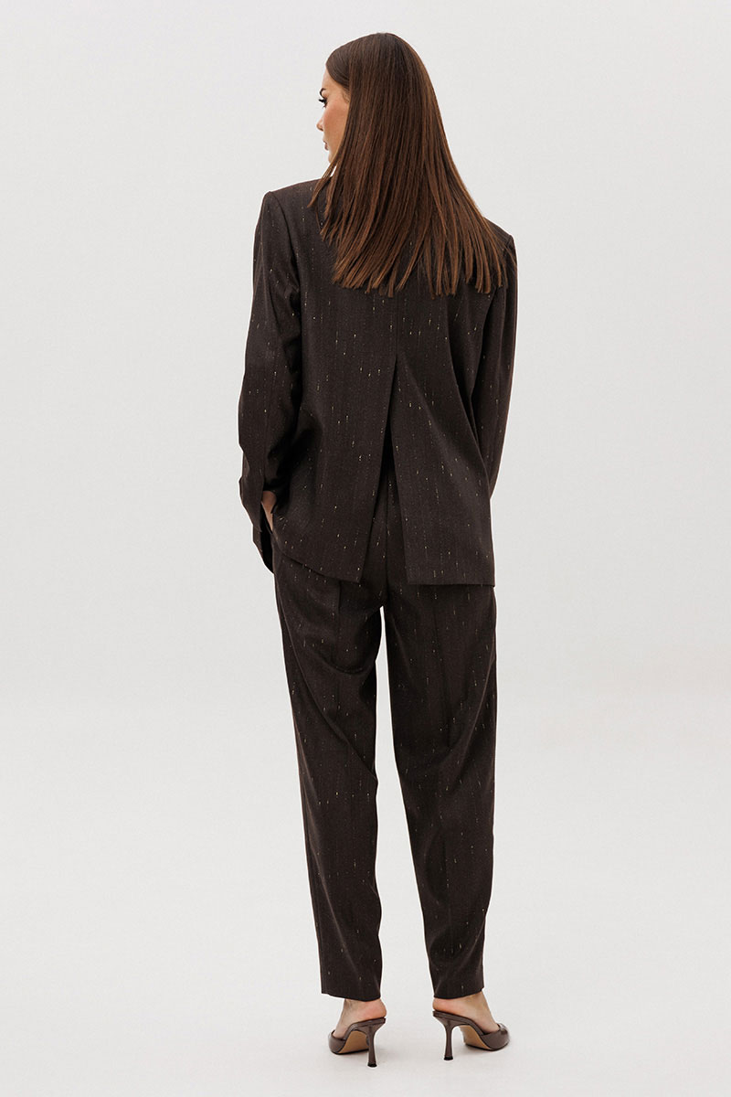 Жакет свободного расширенного силуэта, втачного покроя с центральной застёжкой и классическим английским воротником. Полочка с отрезным бочком, нагрудной вытачкой и прорезным карманом с клапаном. Спинка с центральным швом, шлицей и отрезным бочком. Рукав двухшовный с отлетной шлицей.