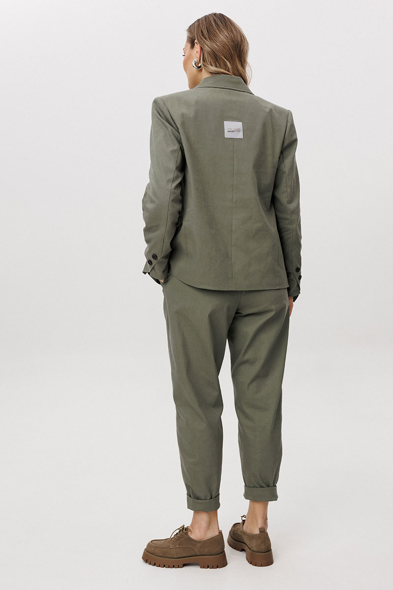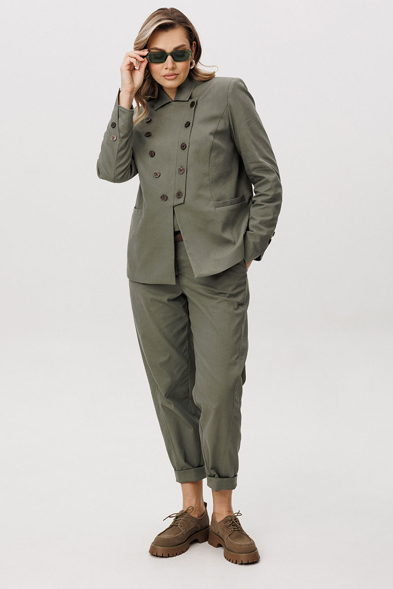 Костюм легко адаптируется под разные стилистические сценарии — от повседневных городских образов до smart casual, сочетаясь как с обувью на плоском ходу, так и с более акцентной парой.