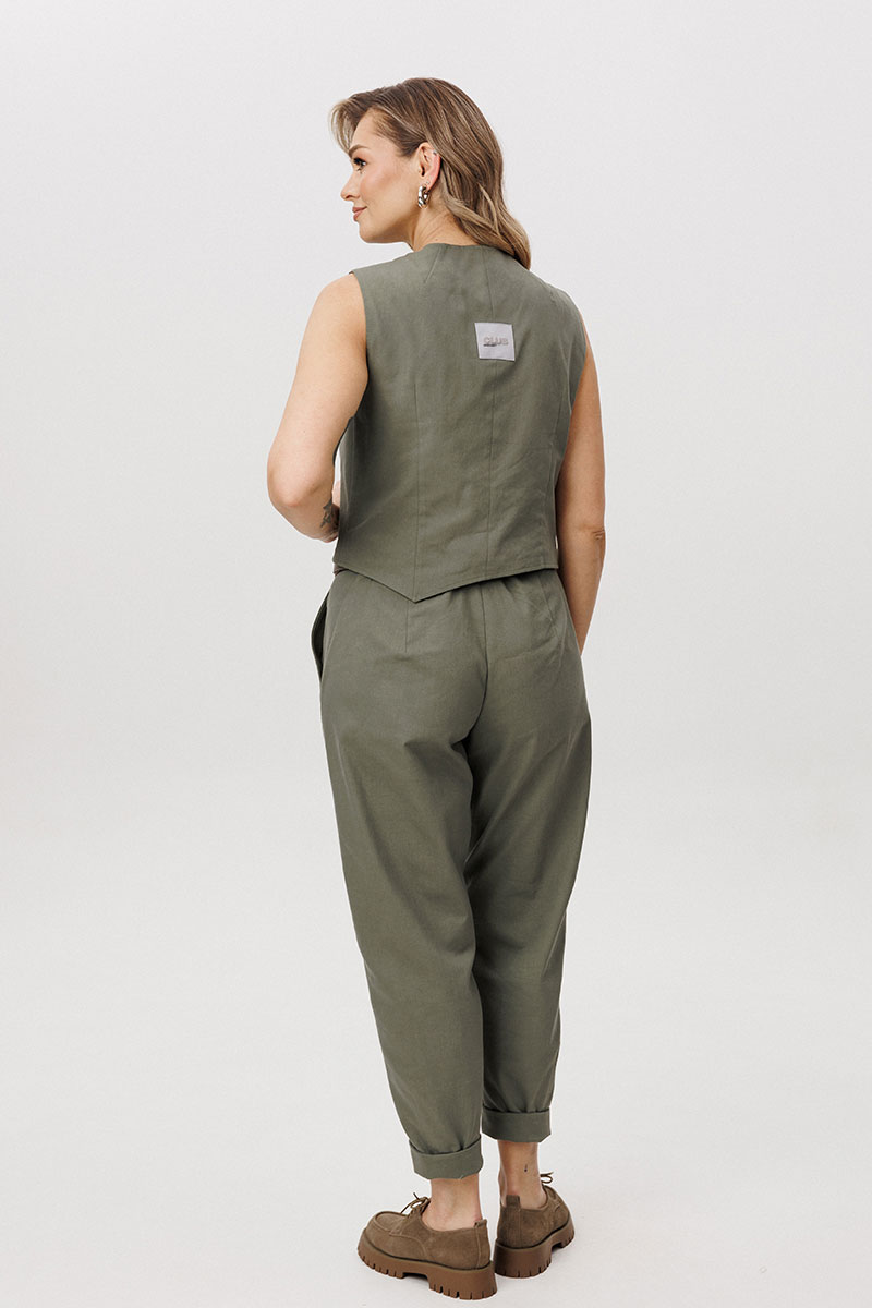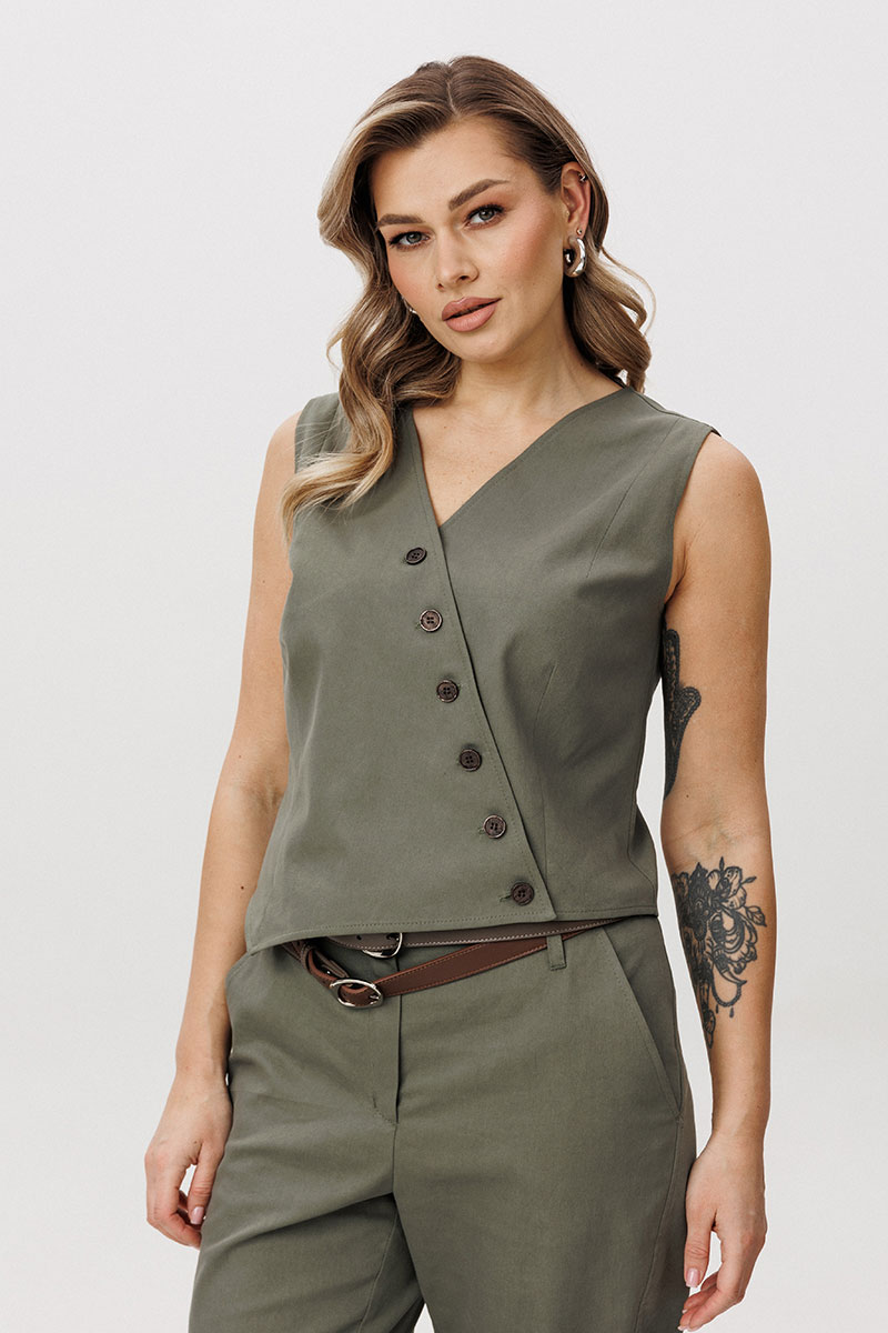Жакет отличается двубортной косой застёжкой, которая легко трансформируется в отложной лацкан. Лацкан фиксируется к полочке с помощью пуговиц, что позволяет менять характер образа — от более строгого к расслабленному. Жилет с асимметричной застёжкой и неровной линией низа добавляет образу архитектурность и подчёркивает дизайнерский подход.