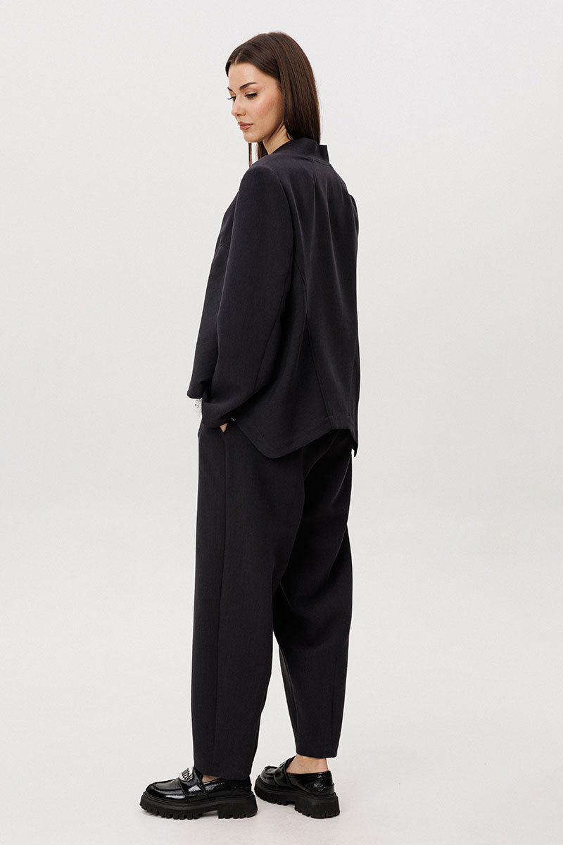 Жакет прямого силуэта выполнен со сложной архитектурной спинкой, создающей выразительный объём и подчёркивающей концептуальный характер модели. Застёжка на молнию добавляет образу графичность и современное звучание.