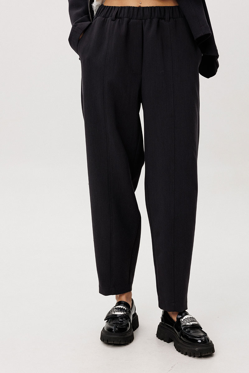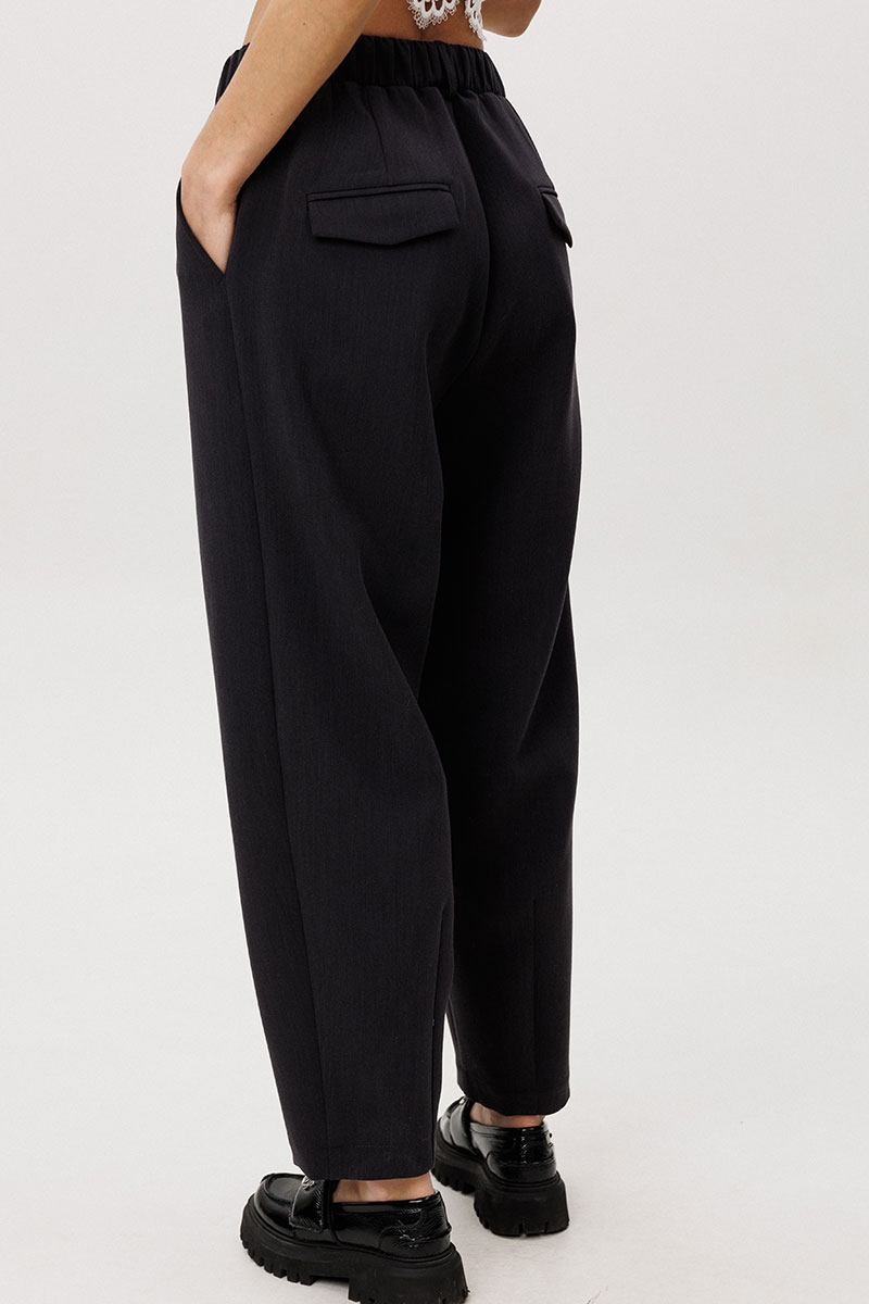 Расслабленные брюки-бананы с мягкой линией кроя обеспечивают комфорт и формируют актуальный силуэт с лёгким акцентом на талии. Хлопчатобумажный топ, декорированный изящным кружевом по нижнему краю, добавляет образу контрастную женственность и завершённость.