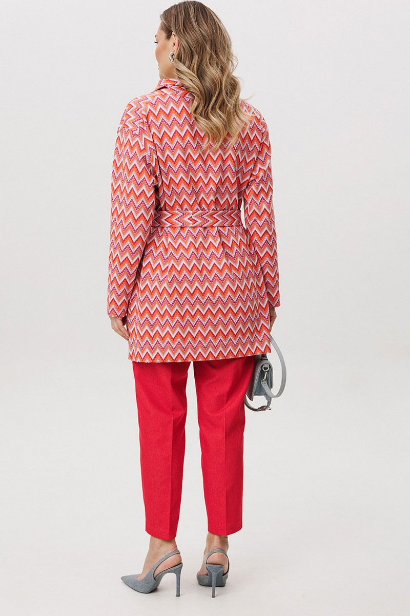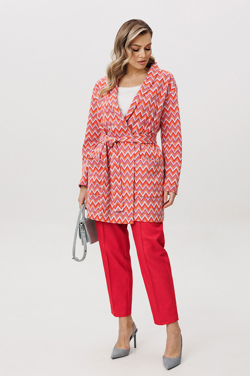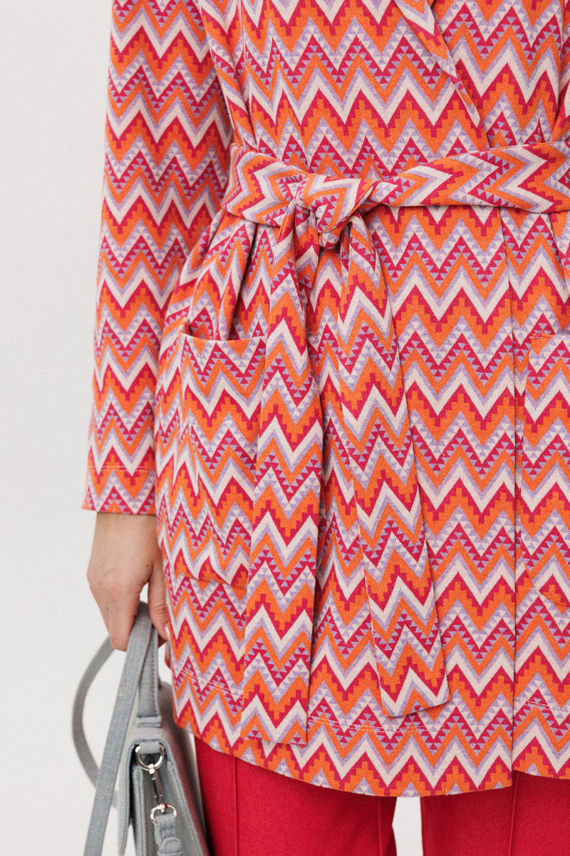 Кардиган выполнен из мягкого трикотажного полотна с декоративным узором, который добавляет образу динамику и подчёркивает его fashion-характер. Прямой силуэт и аккуратная линия плеч делают модель универсальной и легко адаптируемой под разные стилистические сценарии.
