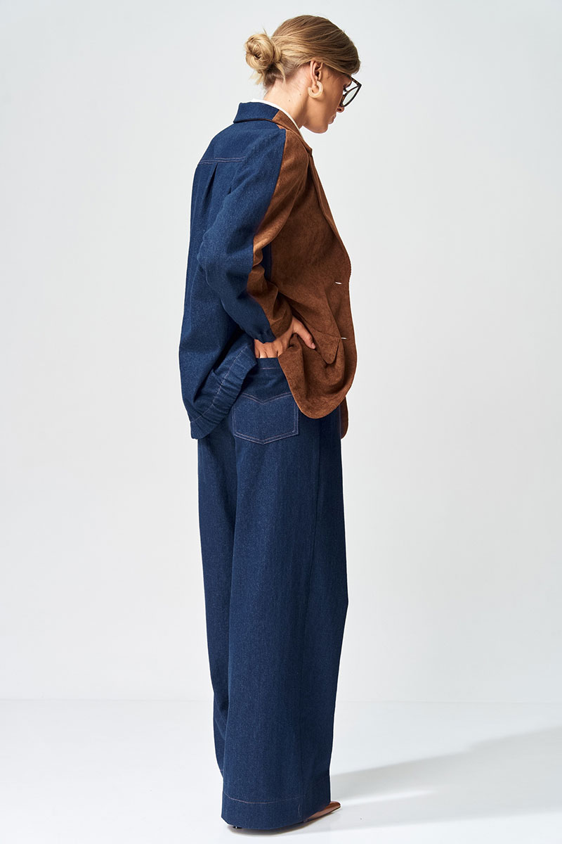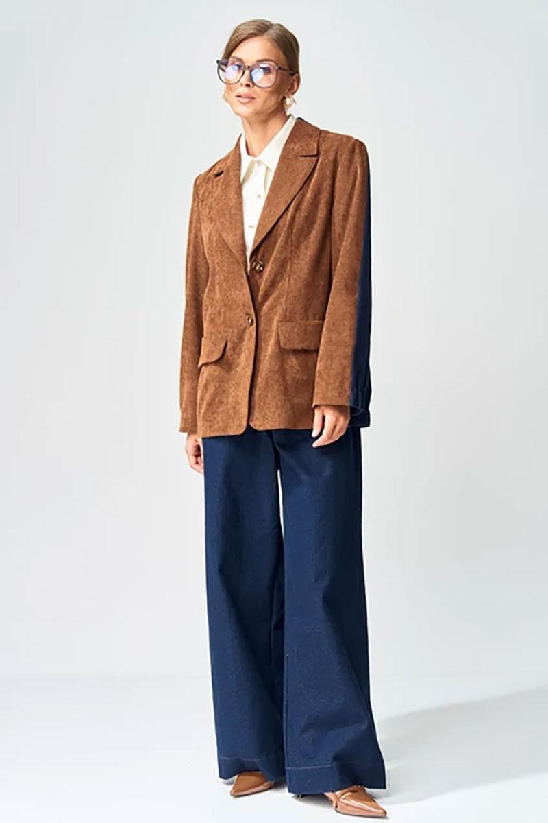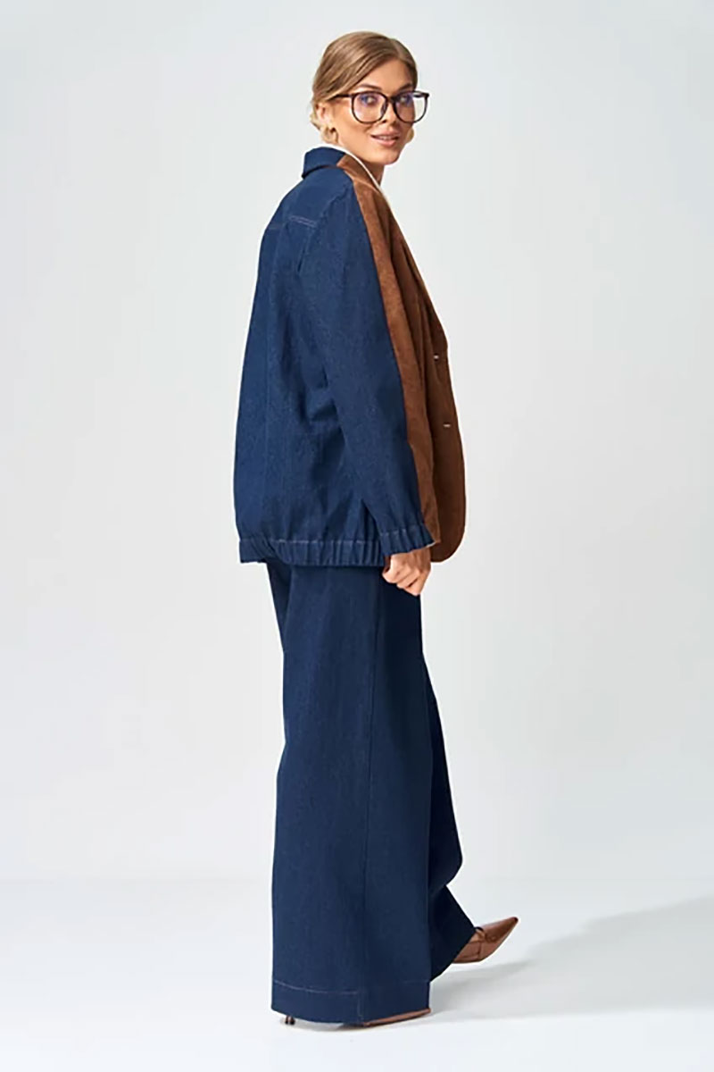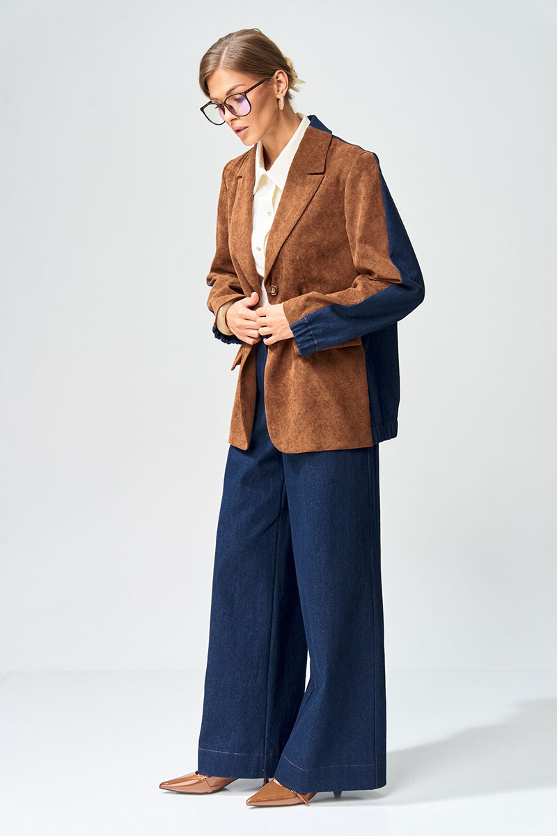 Жакет прямого силуэта сзади с имитацией куртки выполнен из вельветовой и хлопковой джинсовой ткани. Застежка однобортная на 2 петли и пуговицы. Воротник пиджачного типа. Перед с талиевой вытачкой, рельефом и декоративным клапаном. Спинка с кокеткой и складкой. Рукав втачной двухшовный. Низ спинки и нижней части рукава собраны на резинку.