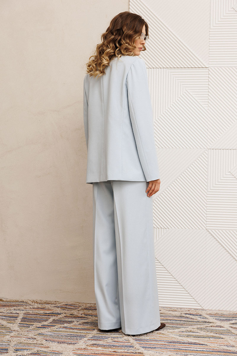 Костюм состоит из жакета и брюк из костюмной вискозной ткани цвета утреннего неба.