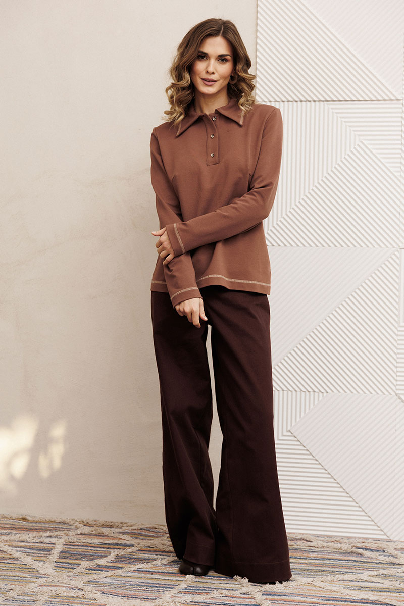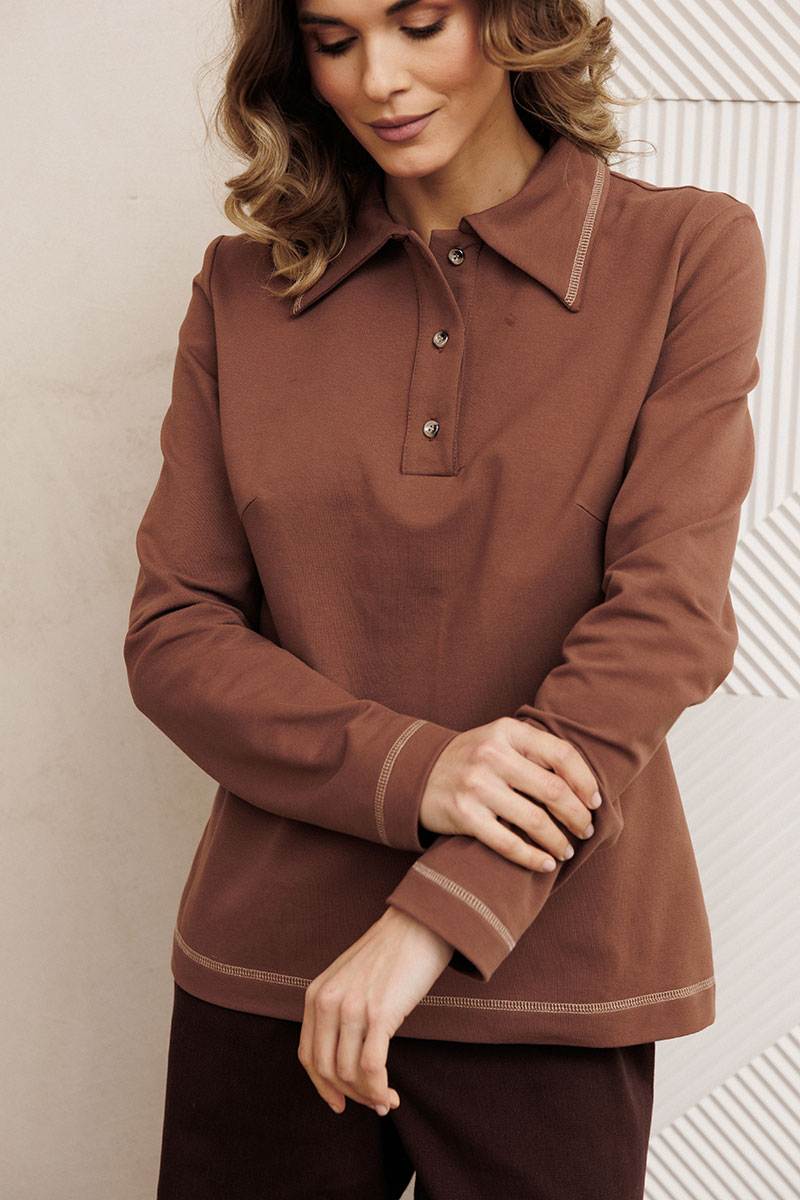 Джемпер прямого силуэта из трикотажного полотна. Перед с застежкой поло и нагрудными вытачками. По воротнику, низу изделия и низу рукава отстрочена декоративная строчка.