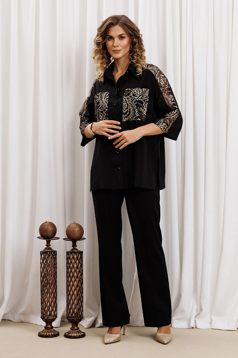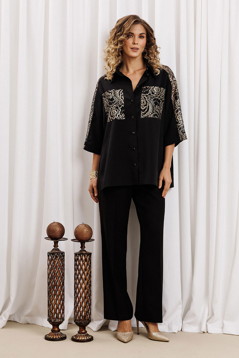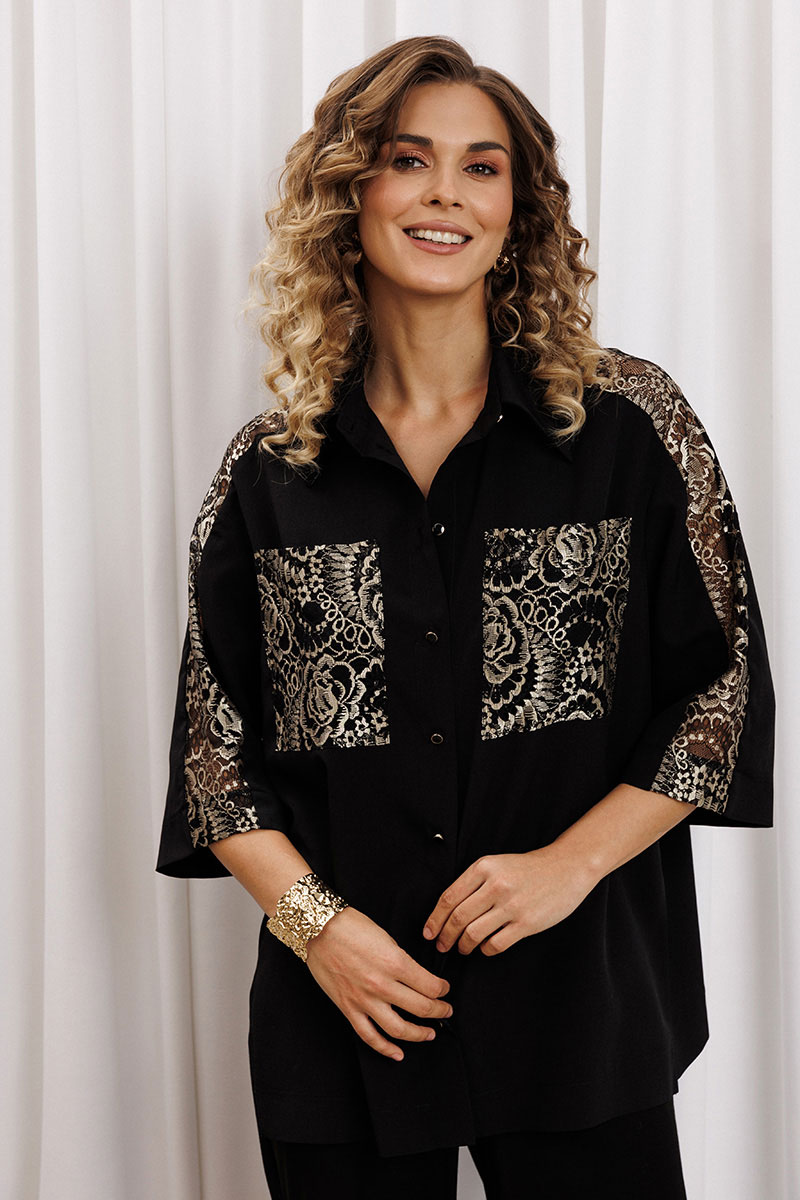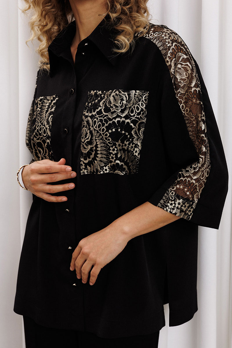 Рубашка свободного силуэта из из блузочного крепа. Застежка центральная на петли и пуговицы, воротник на стойке. В боковых швах разрезы. Рукав втачной рубашечного кроя. Карманы спереди и вставка вдоль плеча и рукава выполнеы из кружева.