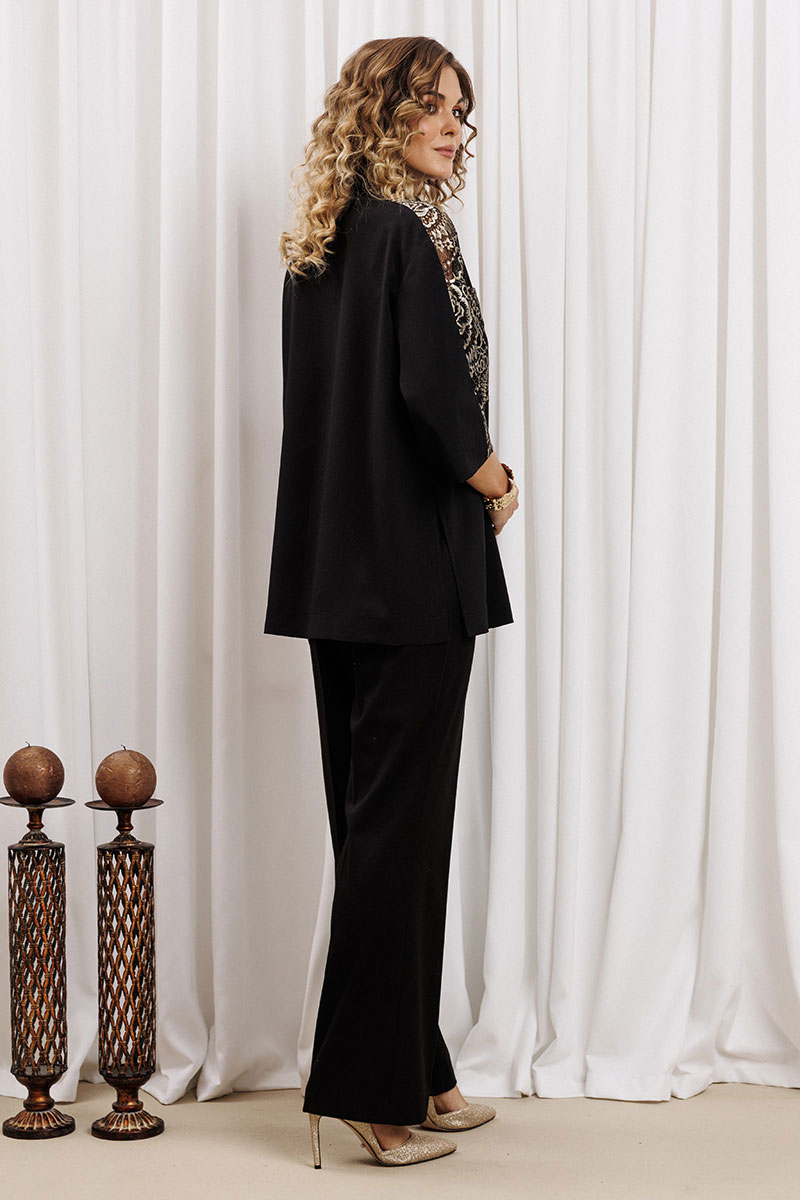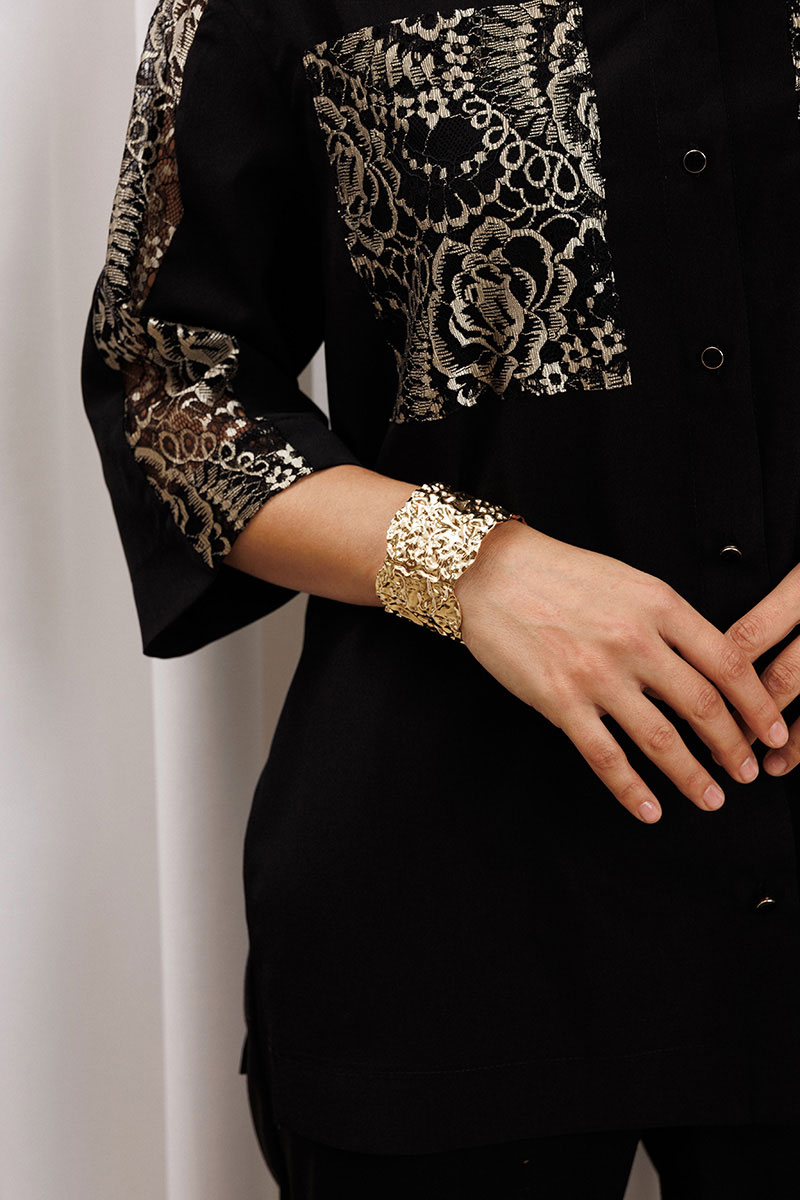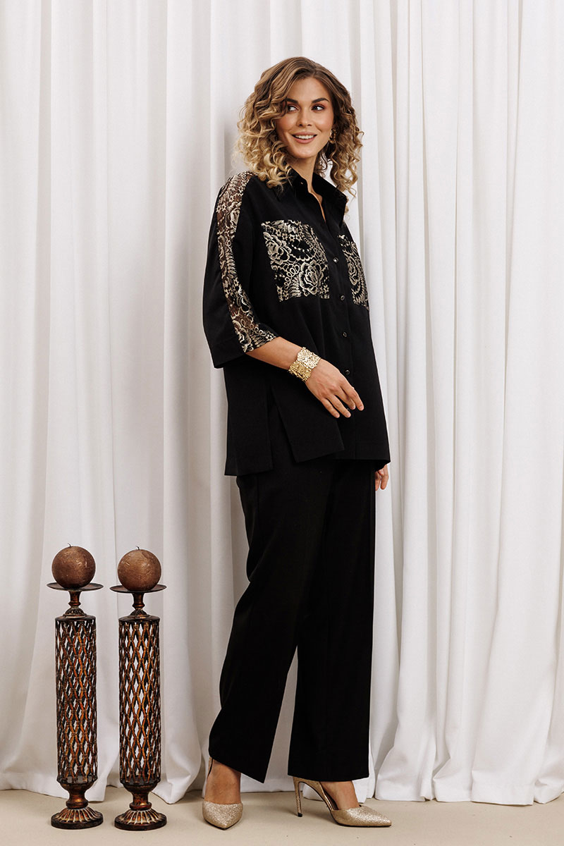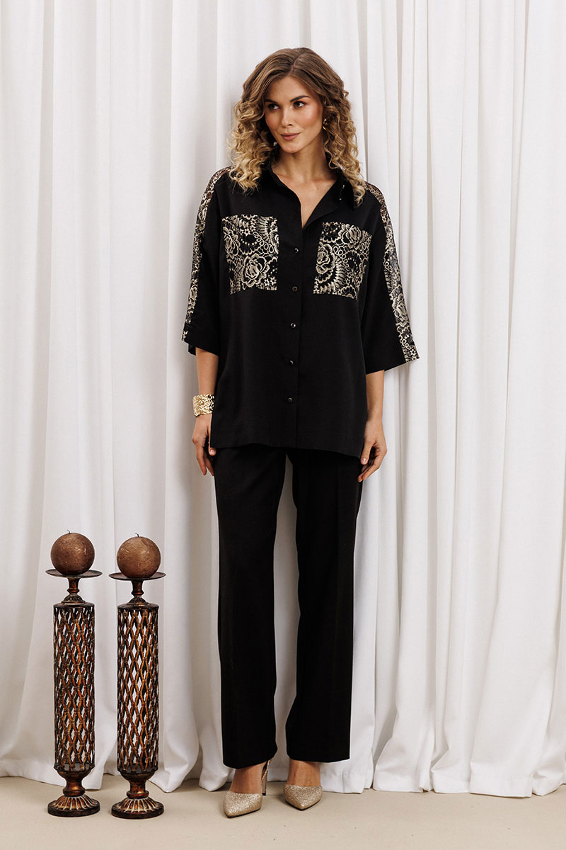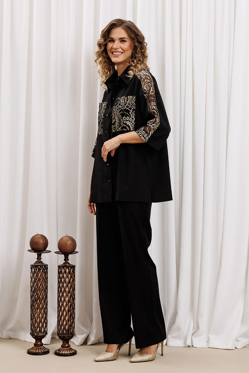 Рубашка свободного силуэта из из блузочного крепа. Застежка центральная на петли и пуговицы, воротник на стойке. В боковых швах разрезы. Рукав втачной рубашечного кроя. Карманы спереди и вставка вдоль плеча и рукава выполнеы из кружева.
